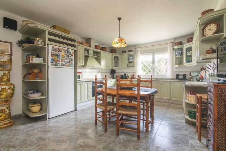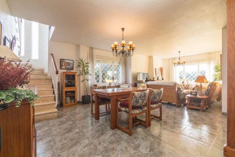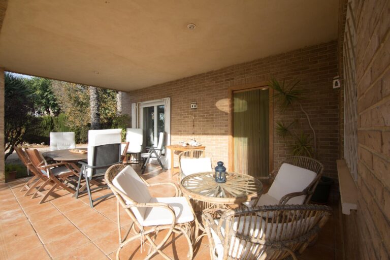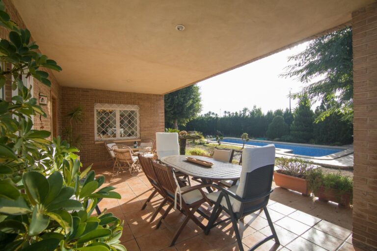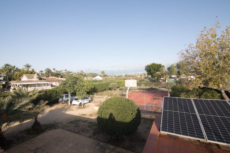 El exterior es igualmente impresionante; el chalet está situado sobre una extensa parcela vallada que abarca aproximadamente 3.344 m², ofreciéndote privacidad e independencia. En ella podrás disfrutar de diferentes áreas de descanso o reuniones familiares: la pista de padel, barbacoa y sobre todo a su piscina privada acompañada por hermosos árboles decorativos alrededor. Y no falta el espacio para el huerto propio y árboles frutales ya en producción que harán las delicias de los paladares de sus propietarios.