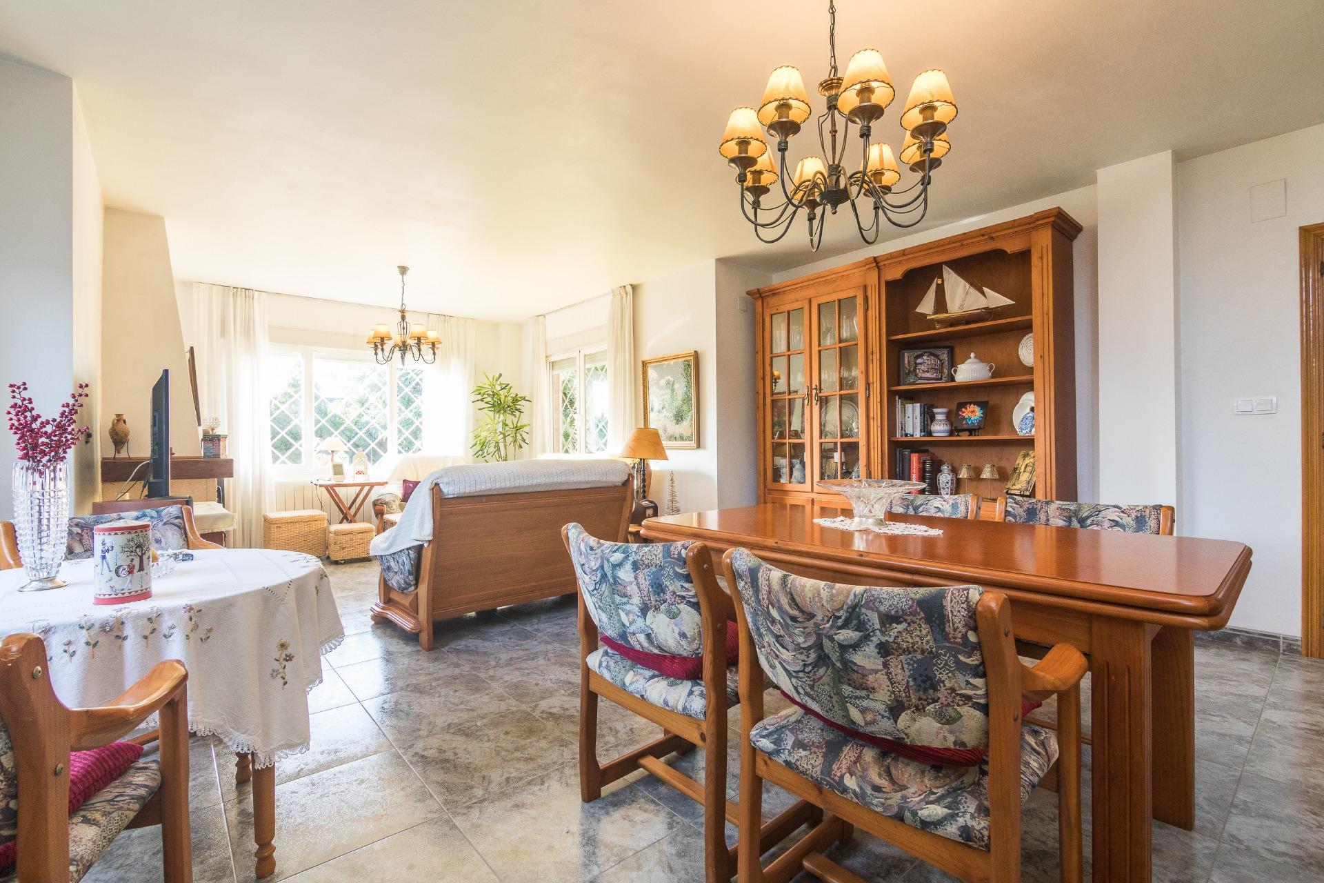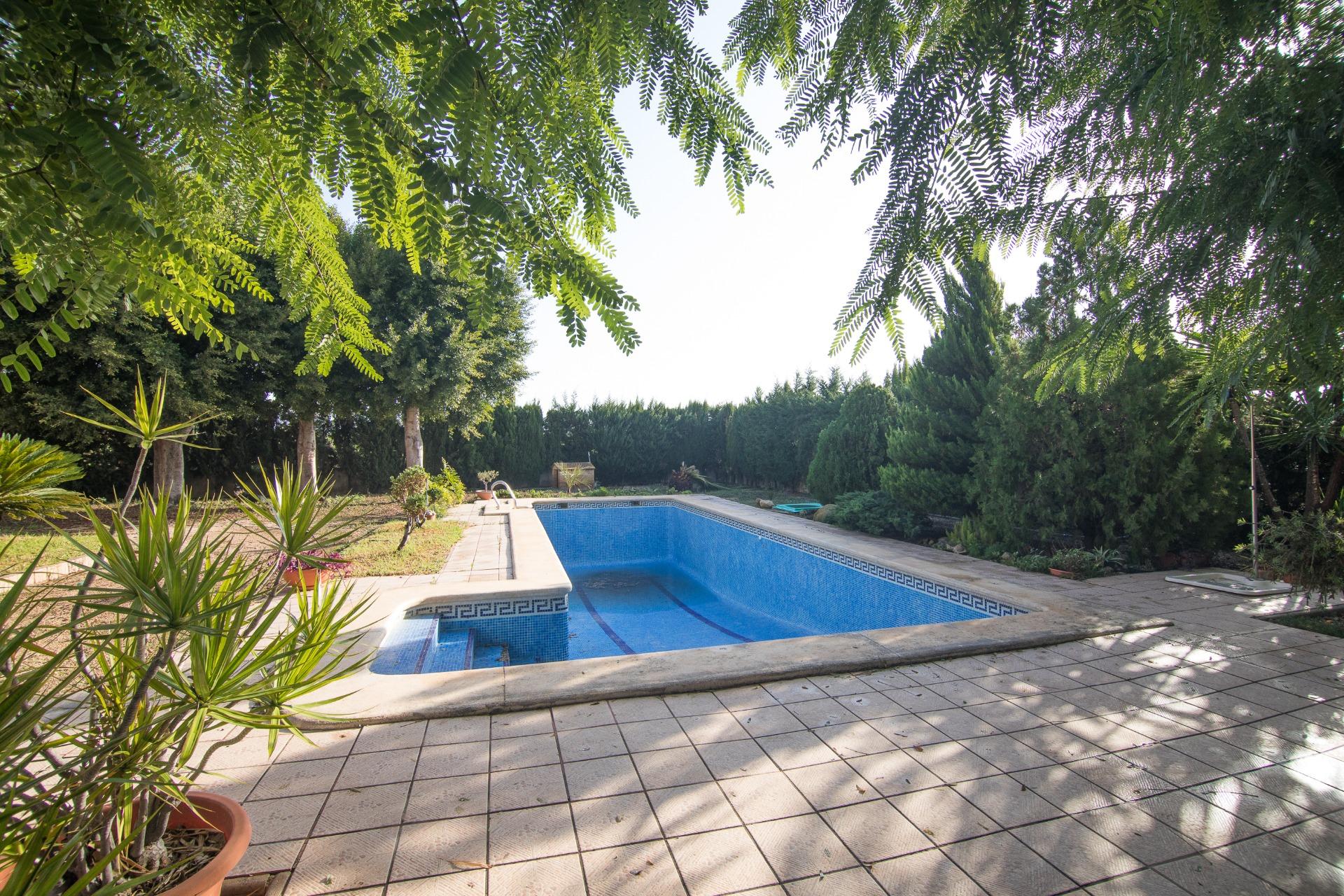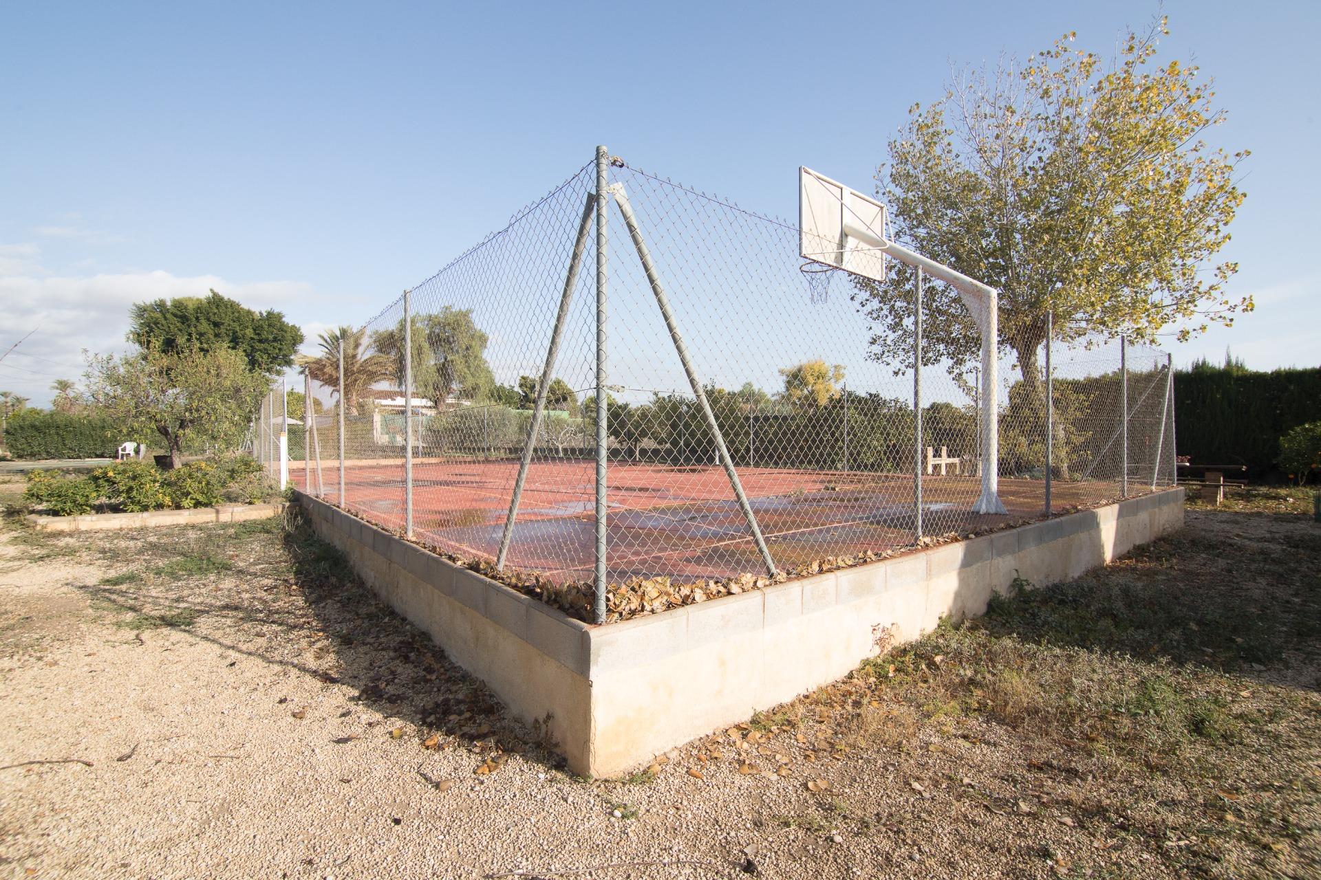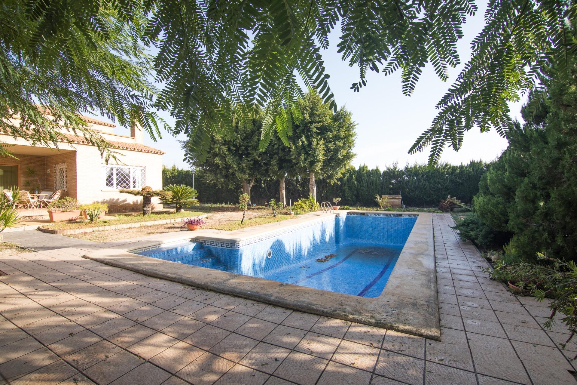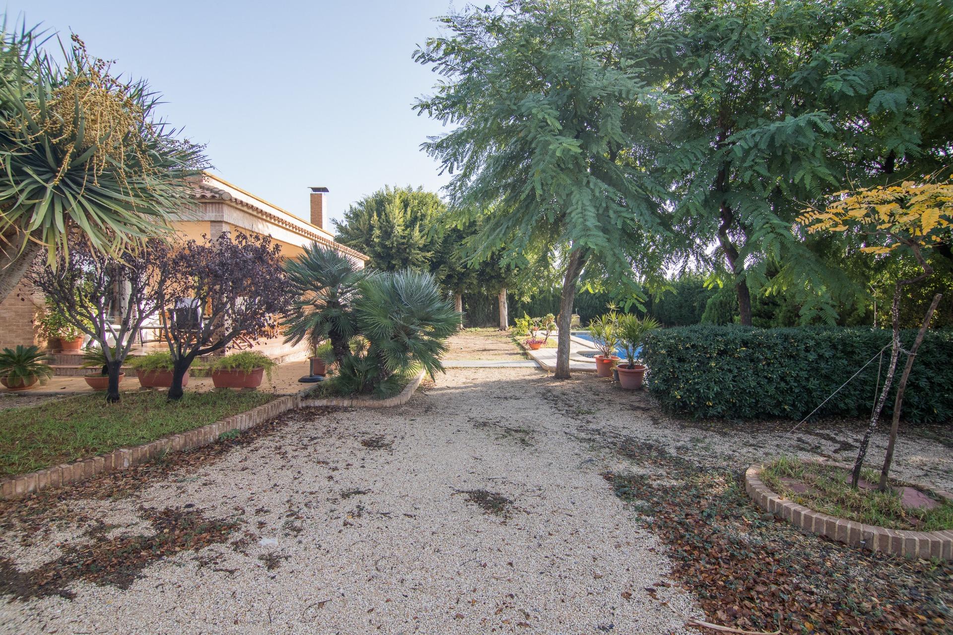El exterior es igualmente impresionante; el chalet está situado sobre una extensa parcela vallada que abarca aproximadamente 3.344 m², ofreciéndote privacidad e independencia. En ella podrás disfrutar de diferentes áreas de descanso o reuniones familiares: la pista de padel, barbacoa y sobre todo a su piscina privada acompañada por hermosos árboles decorativos alrededor. Y no falta el espacio para el huerto propio y árboles frutales ya en producción que harán las delicias de los paladares de sus propietarios.