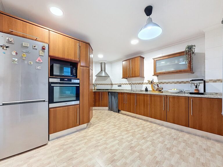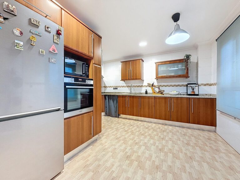 La cocina es amplia, práctica y muy funcional. Dispone de mobiliario de cerezo, gran capacidad de almacenaje y acceso a una galería acristalada que aporta un espacio extra muy útil como zona de lavado y apoyo.