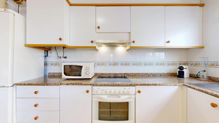 La Cocina office, amplia y abierta al salón/comedor, está equipada con muebles en bajos y altillos, puertas lacadas en blanco y detalles en madera. Provista con vitrocerámica, horno, campana y calentador eléctrico.
