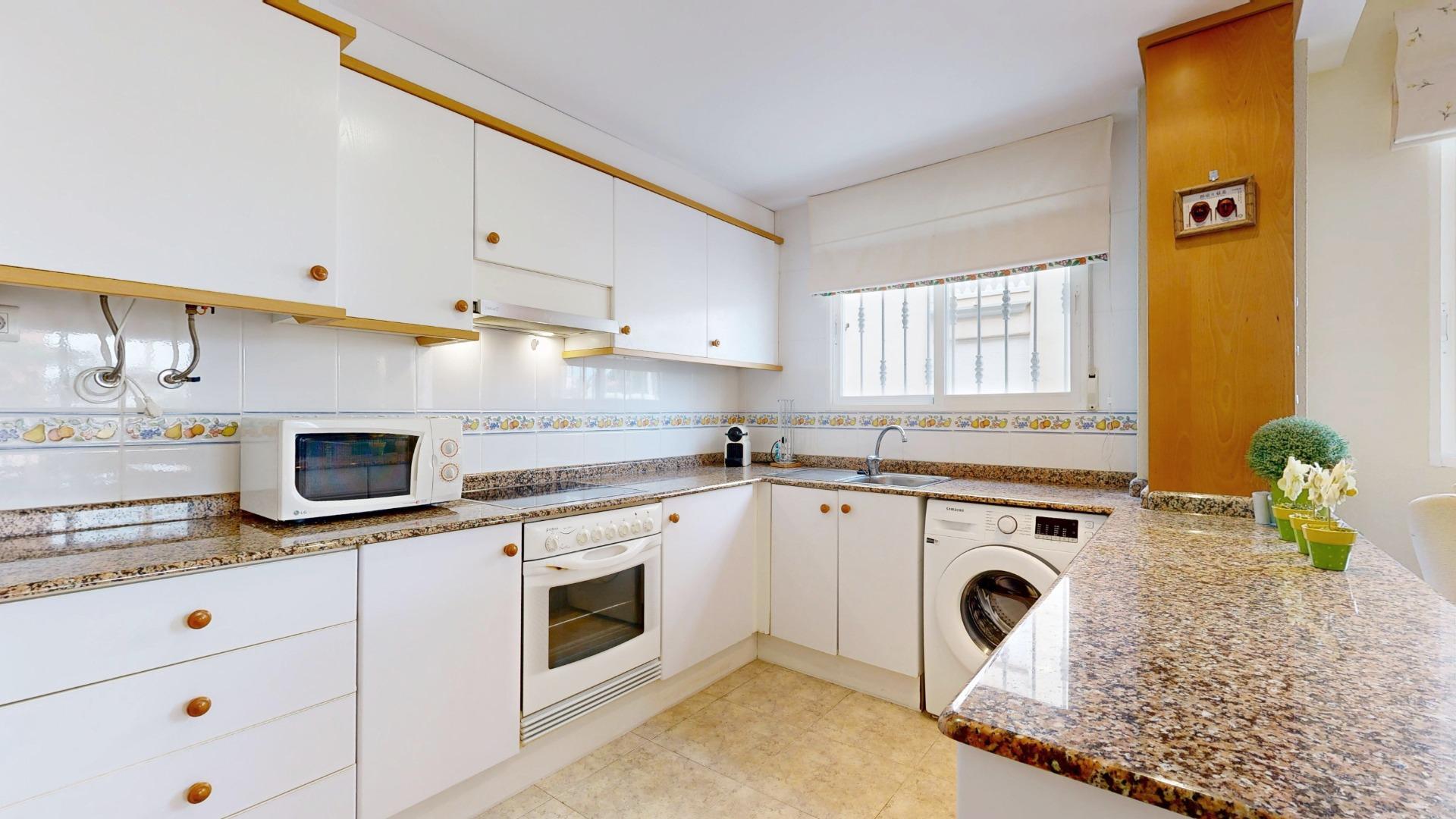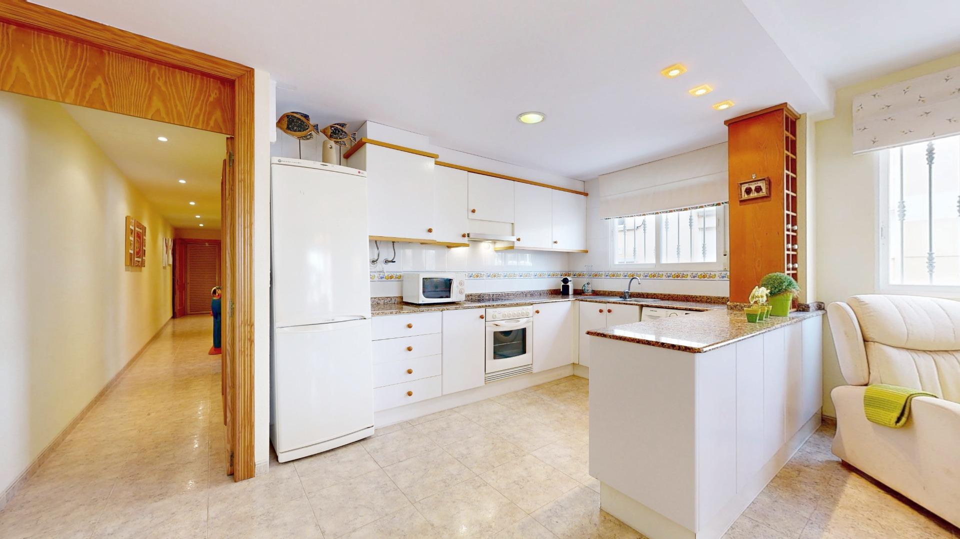 La Cocina office, amplia y abierta al salón/comedor, está equipada con muebles en bajos y altillos, puertas lacadas en blanco y detalles en madera. Provista con vitrocerámica, horno, campana y calentador eléctrico.