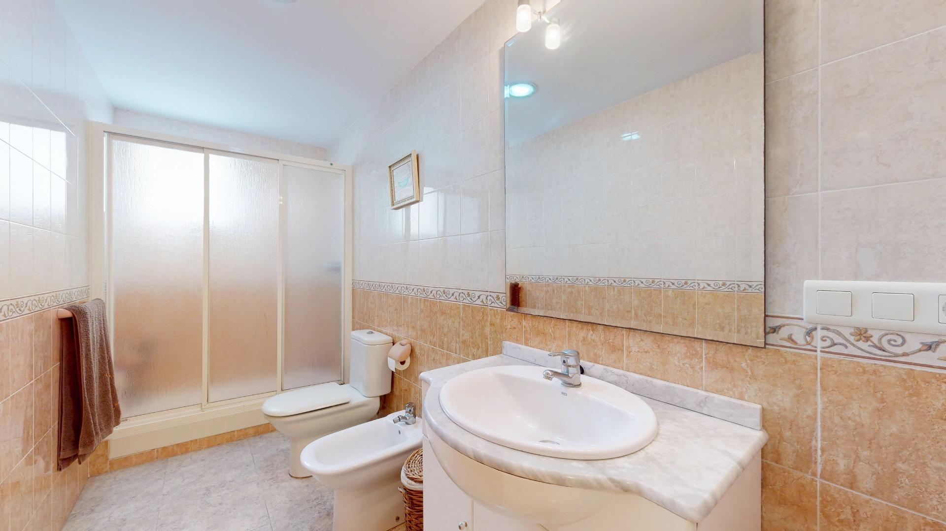 El baño, cuenta con un mueble bajo lavabo y una amplia ducha con mampara
