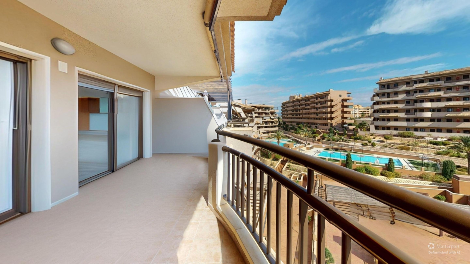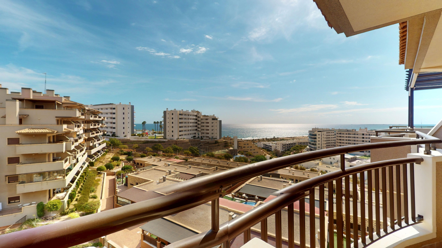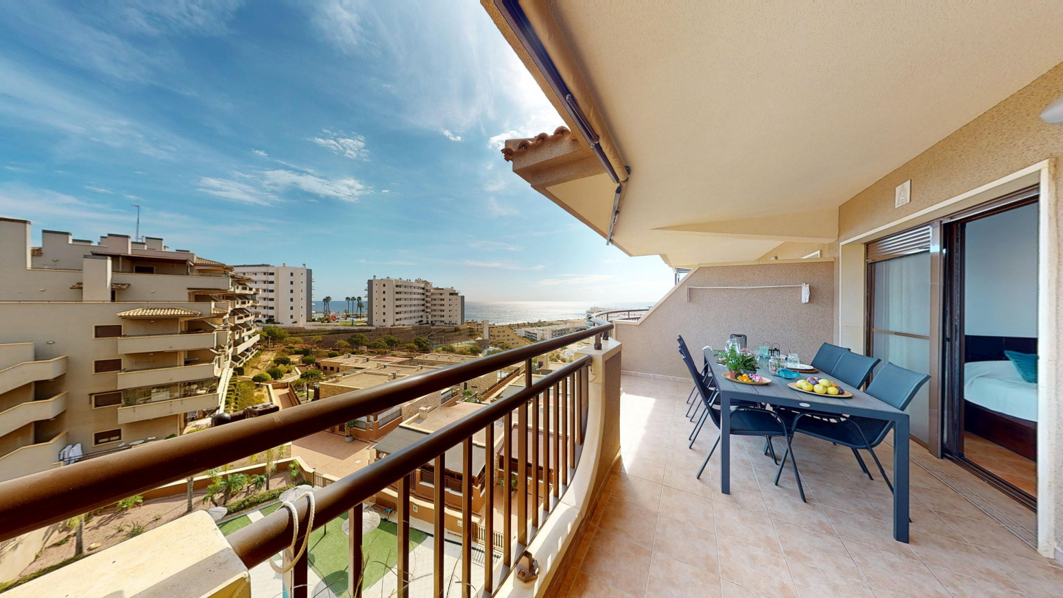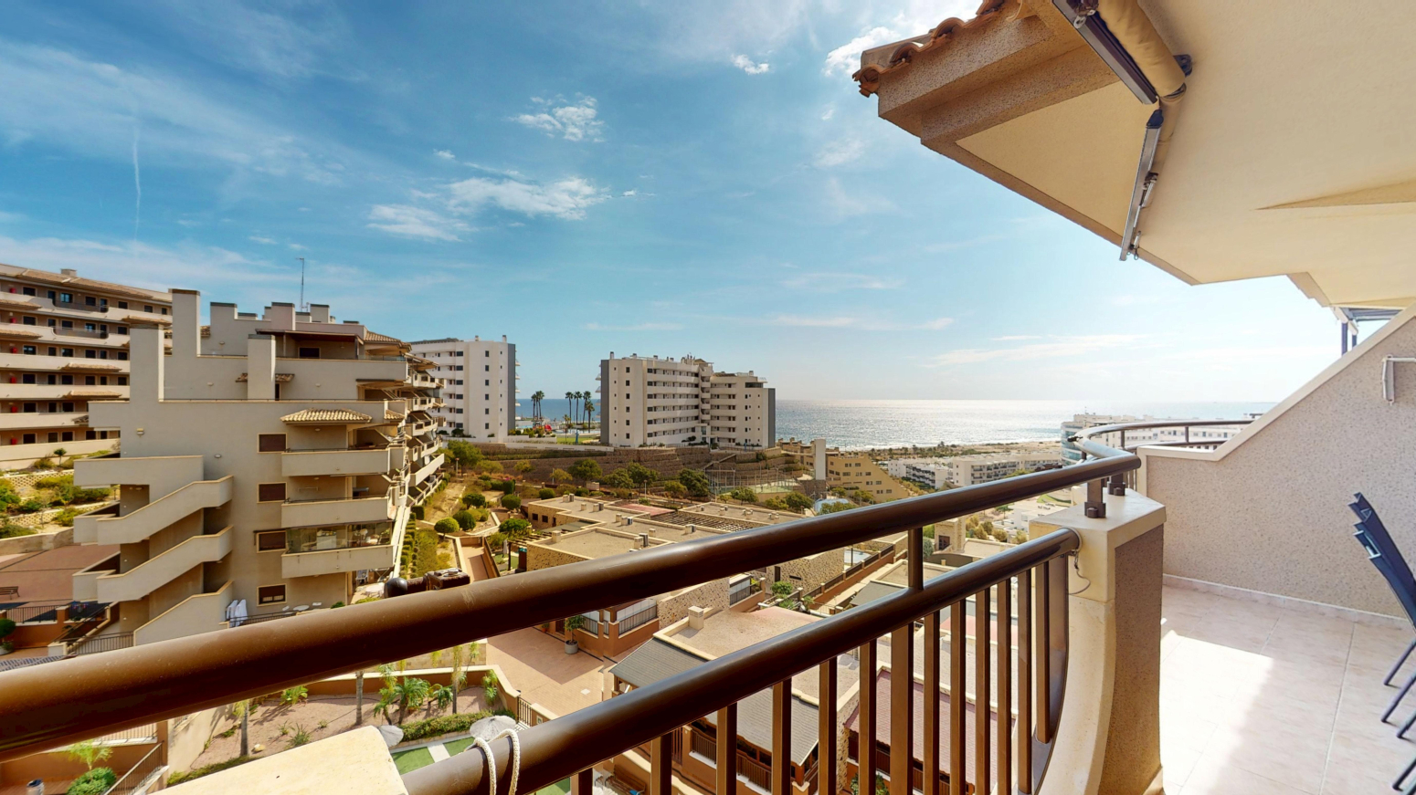 -TERRAZA de 25m2 con salida desde el salón comedor y desde la habitación principal ,con vistas al mar y a la piscina comunitaria