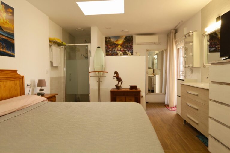 Dormitorio principal en planta baja (más de 20 m²): Uno de los grandes valores de esta vivienda es su dormitorio principal en planta baja, amplio y funcional, ideal para quienes buscan evitar escaleras o priorizan la comodidad. Incluye: armarios a medida, ducha independiente, zona de aseo con lavabo, WC y bidé, aire acondicionado frío/calor mediante split y ventilador de techo. Una distribución que aporta independencia y confort.