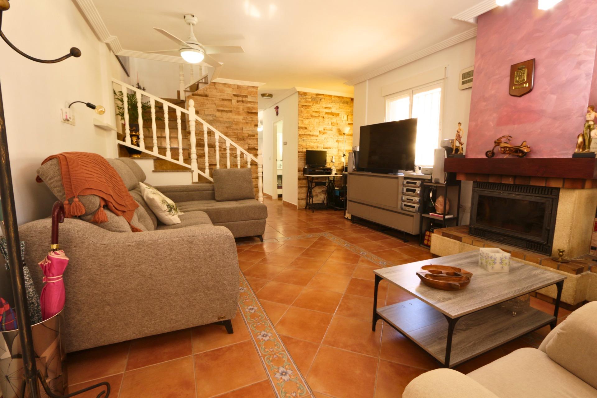 El salón es amplio y acogedor, con chimenea, creando un ambiente cálido y confortable en los meses más frescos.