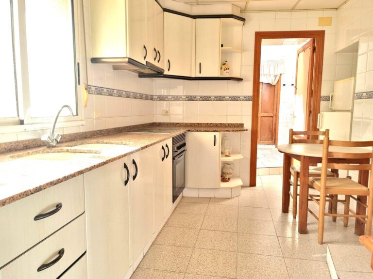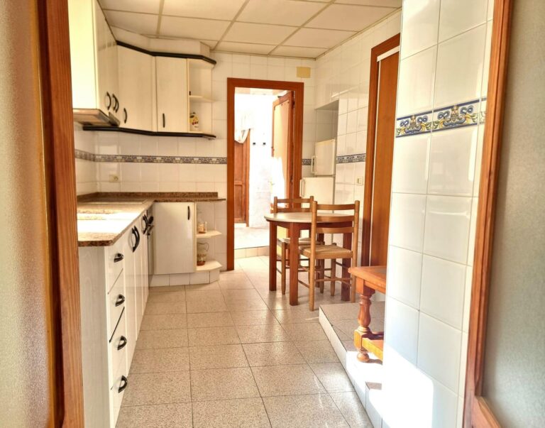 Continuando por el salón se encuentra la cocina con más luz natural y una despensa. Al fondo hay una terraza cubierta y otro trastero. Esta parte se podría utilizar como una habitación más.