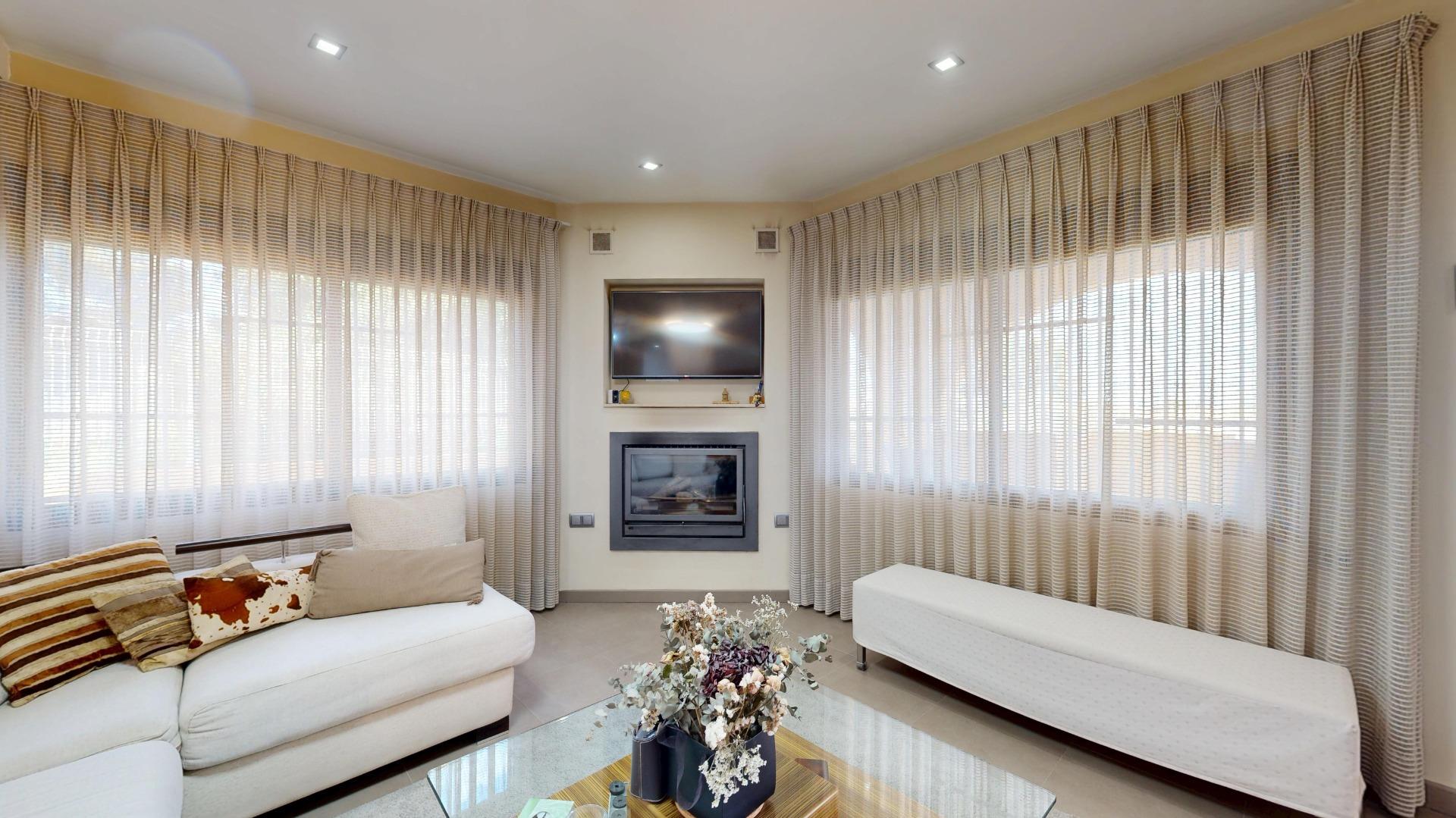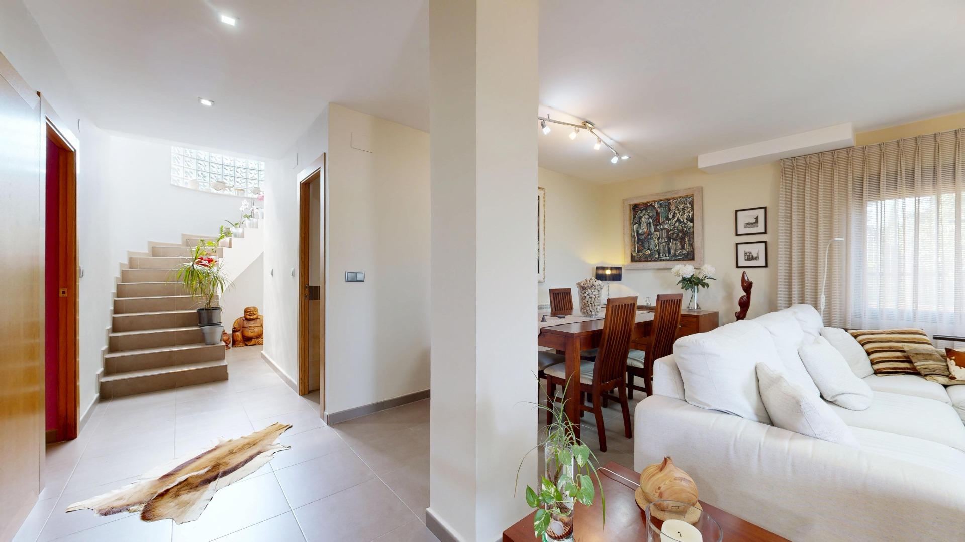 Accede desde una elegante terraza elevada a un amplio salón-comedor con chimenea, baño completo, habitación triple y una cocina moderna con un toque único. A destacar un frontal de pavés de 3x2 metros que inunda de luz natural todo el espacio , nos da acceso por una maravillosas y amplias escaleras a la primera planta.