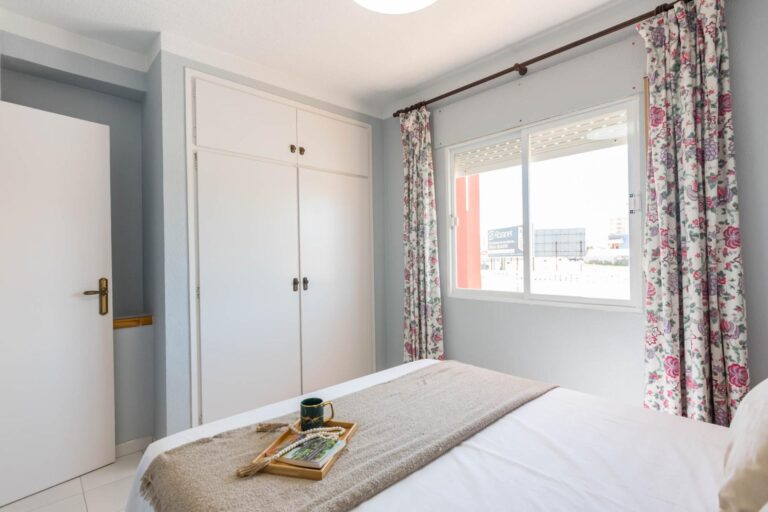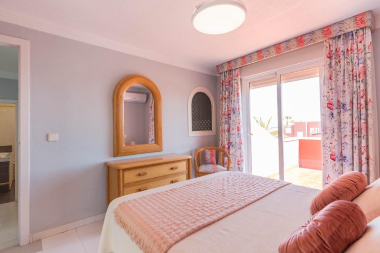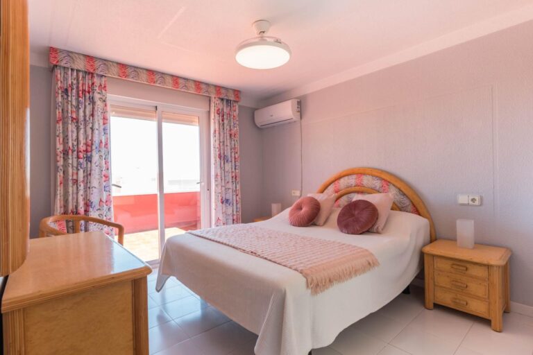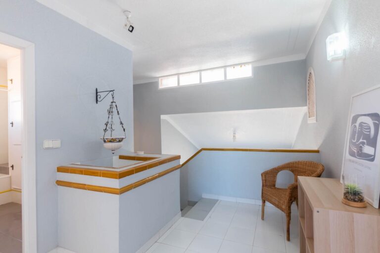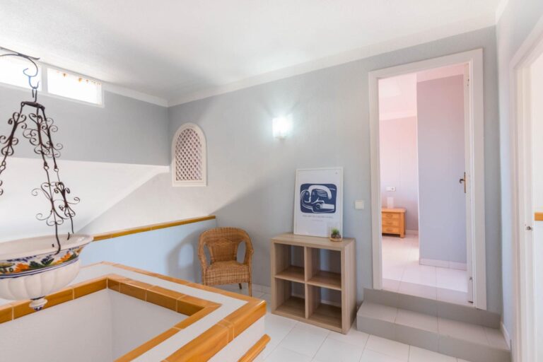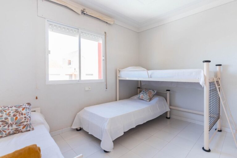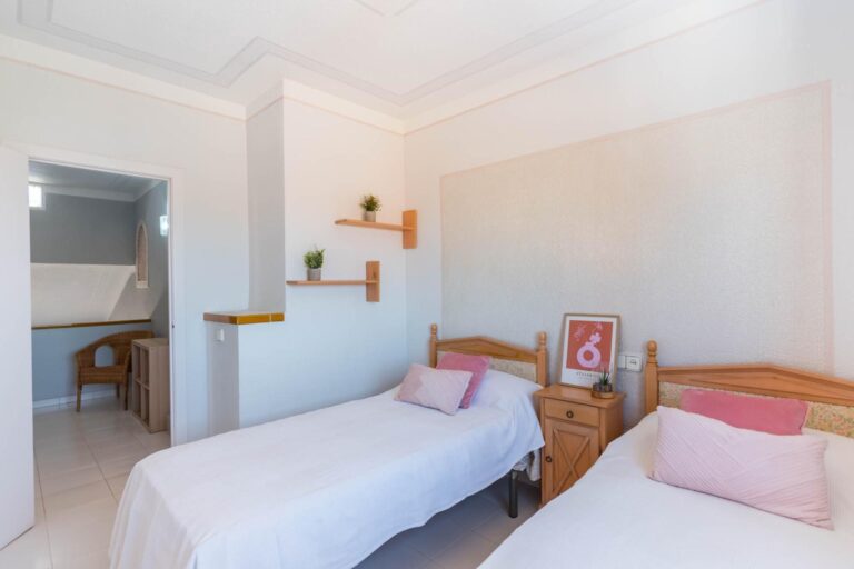 En la planta superior, tres dormitorios llenos de luz natural y un baño completo forman la zona de descanso. El dormitorio principal, ligeramente elevado, dispone de acceso a una terraza privada perfecta para contemplar el atardecer sobre el Mar Menor.