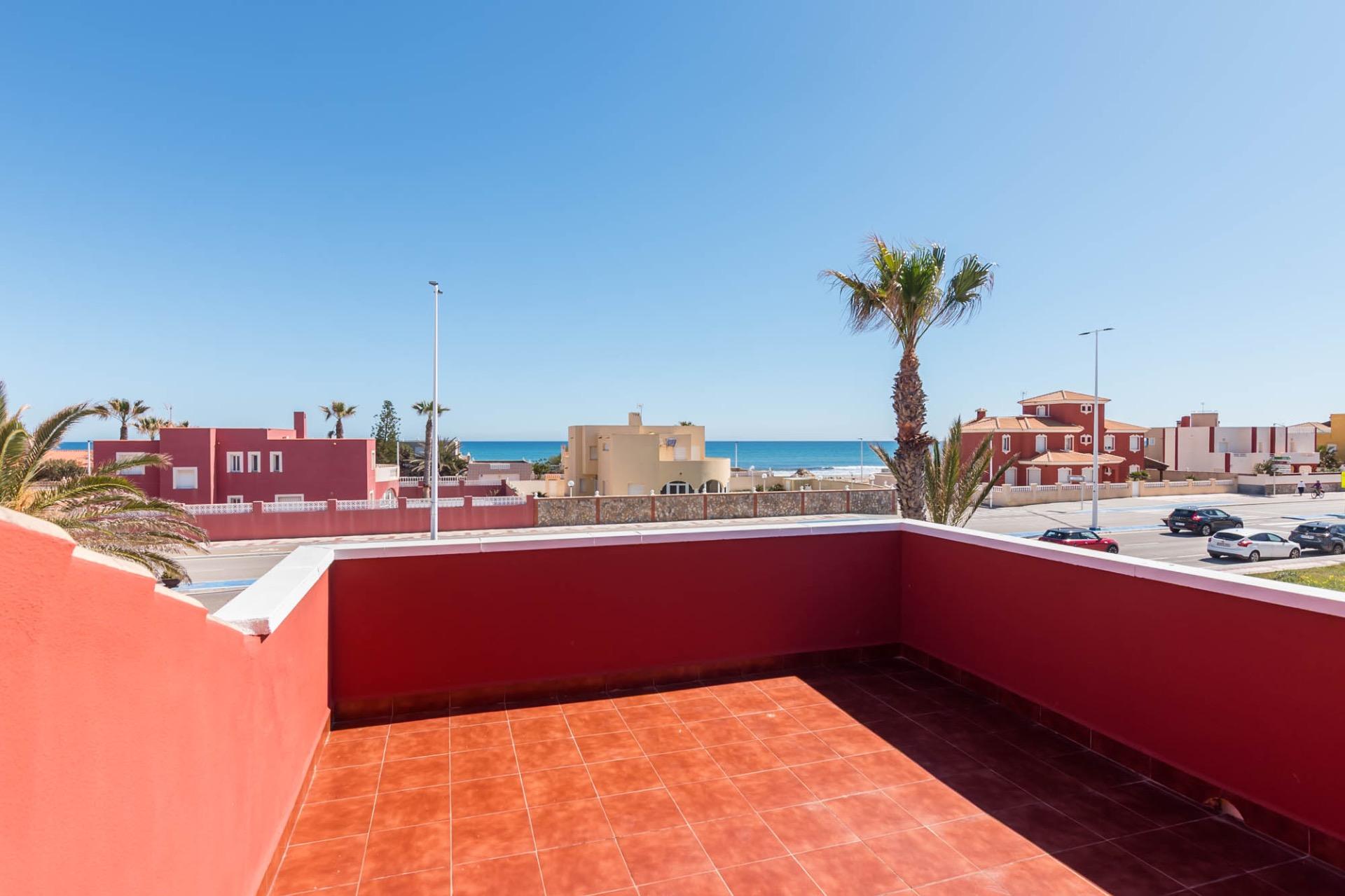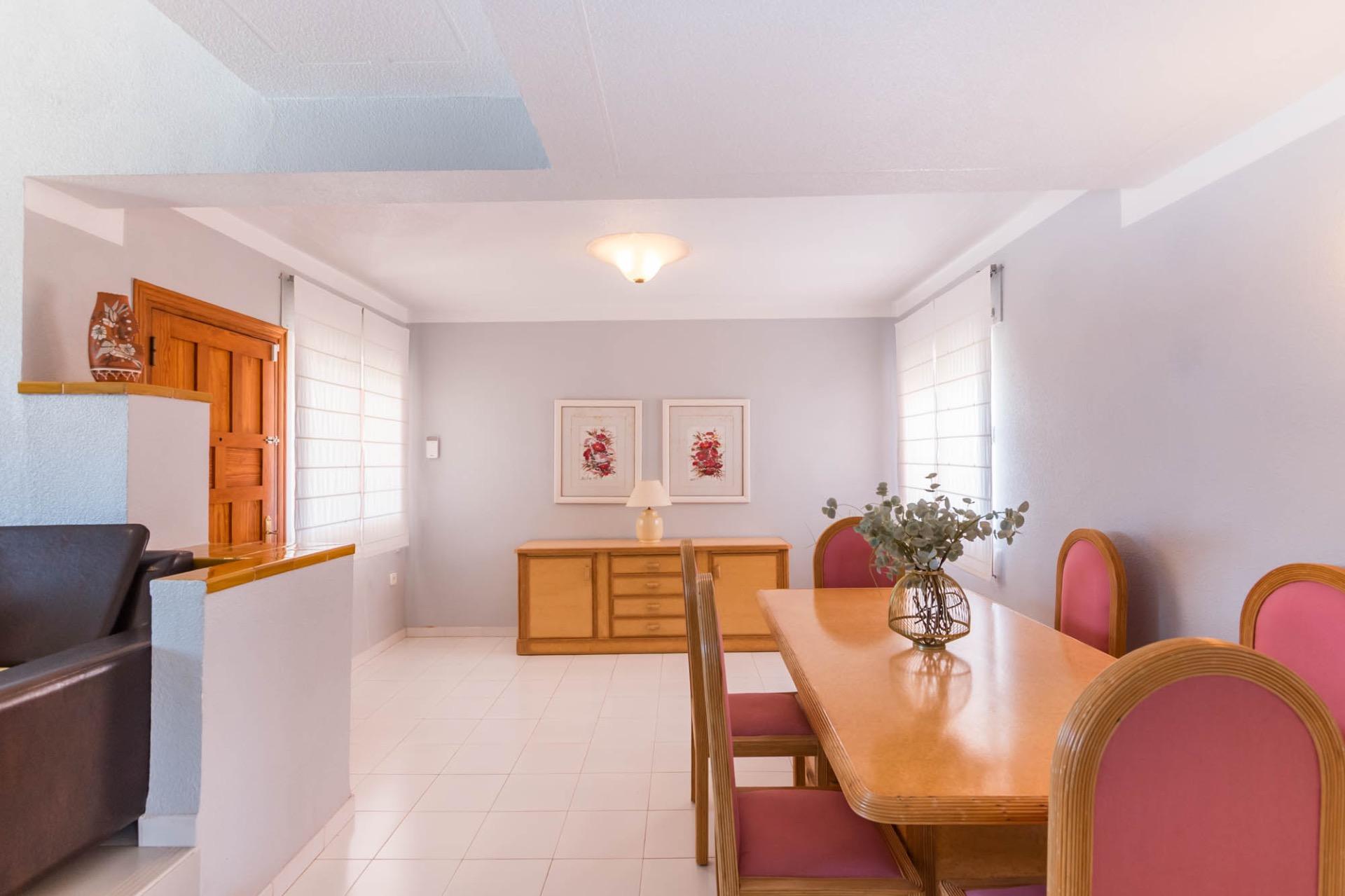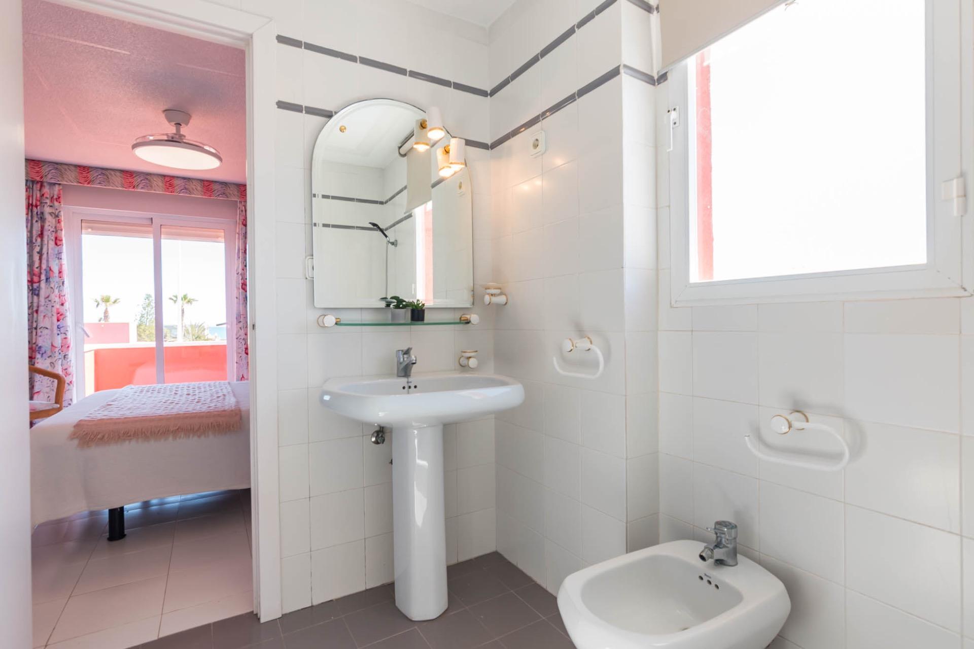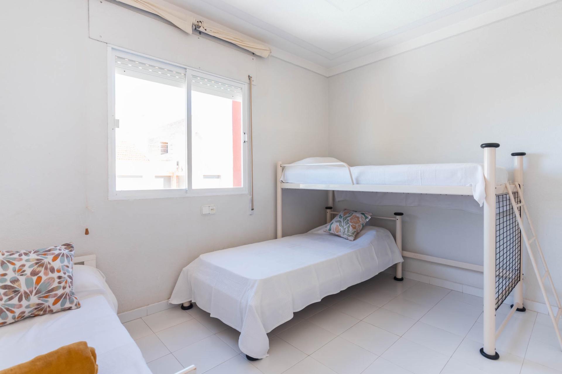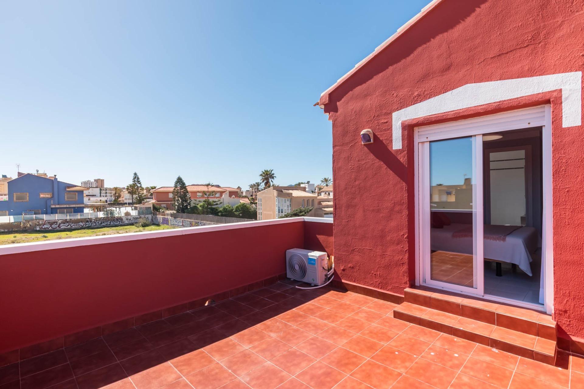 En la planta superior, tres dormitorios llenos de luz natural y un baño completo forman la zona de descanso. El dormitorio principal, ligeramente elevado, dispone de acceso a una terraza privada perfecta para contemplar el atardecer sobre el Mar Menor.