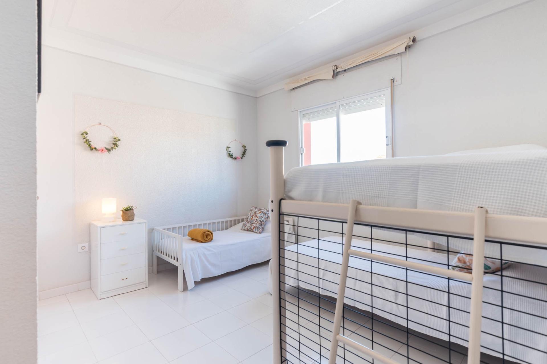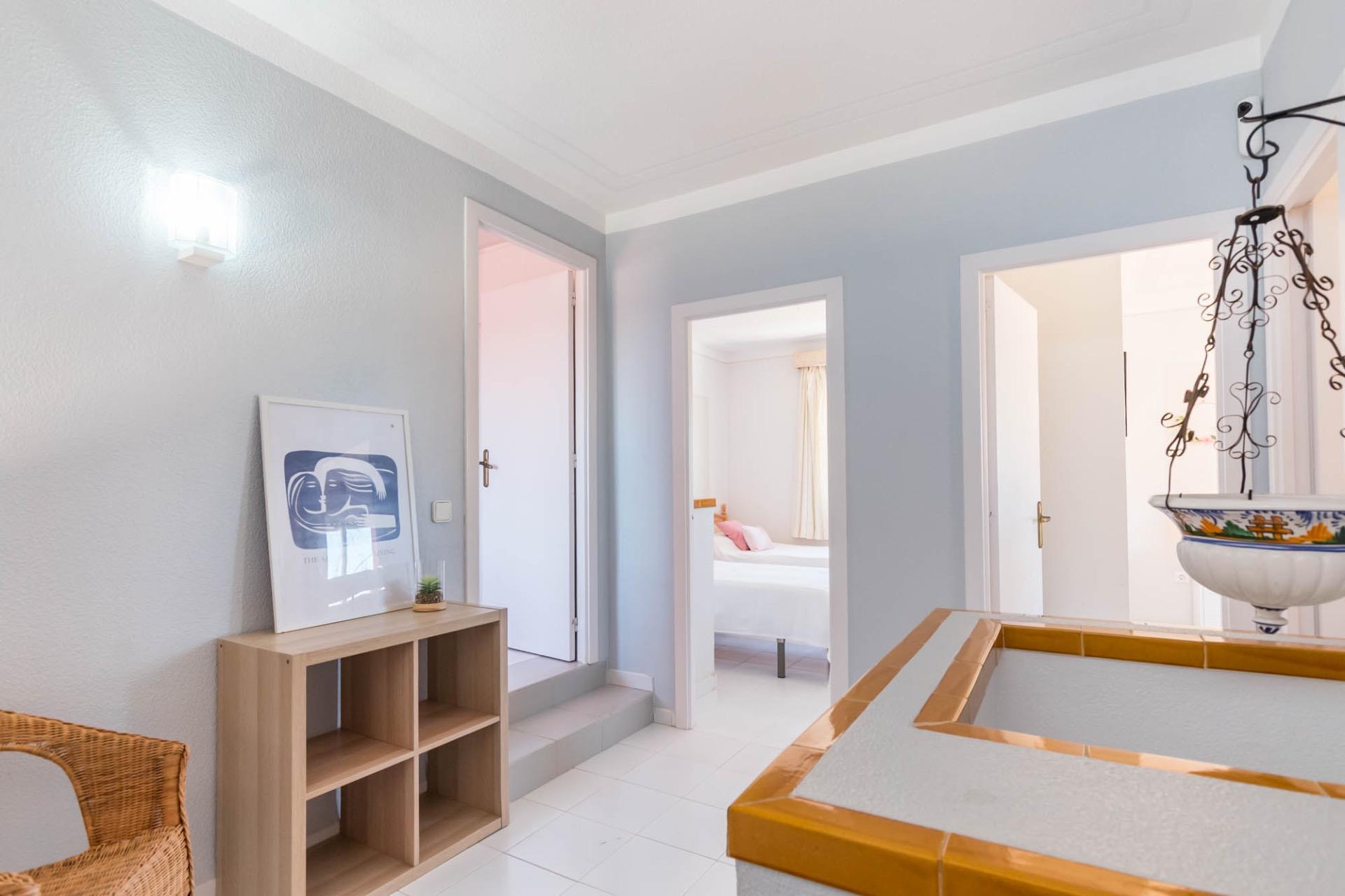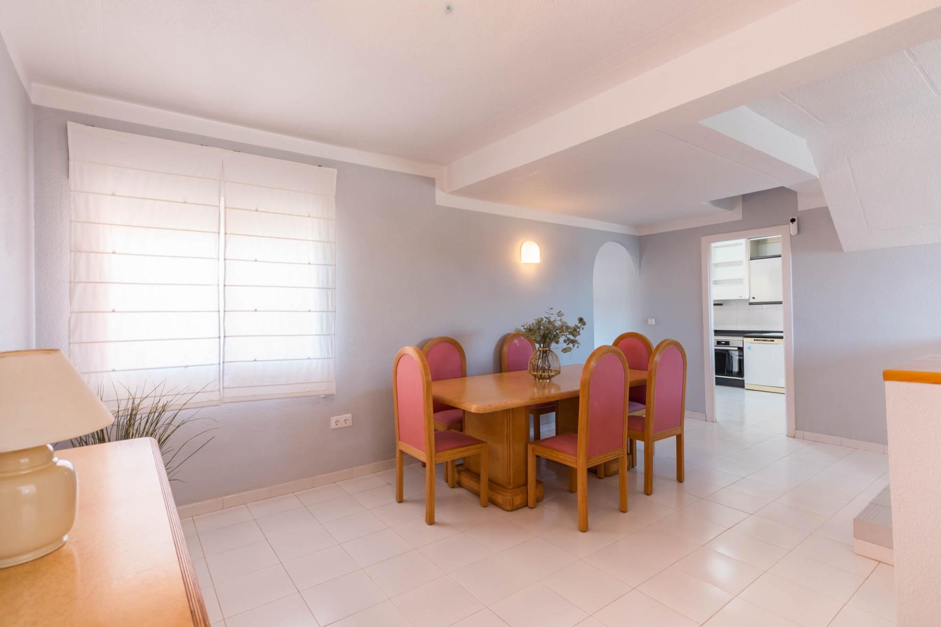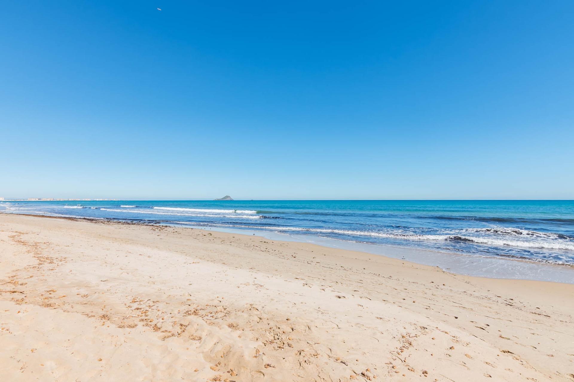 En la planta superior, tres dormitorios llenos de luz natural y un baño completo forman la zona de descanso. El dormitorio principal, ligeramente elevado, dispone de acceso a una terraza privada perfecta para contemplar el atardecer sobre el Mar Menor.