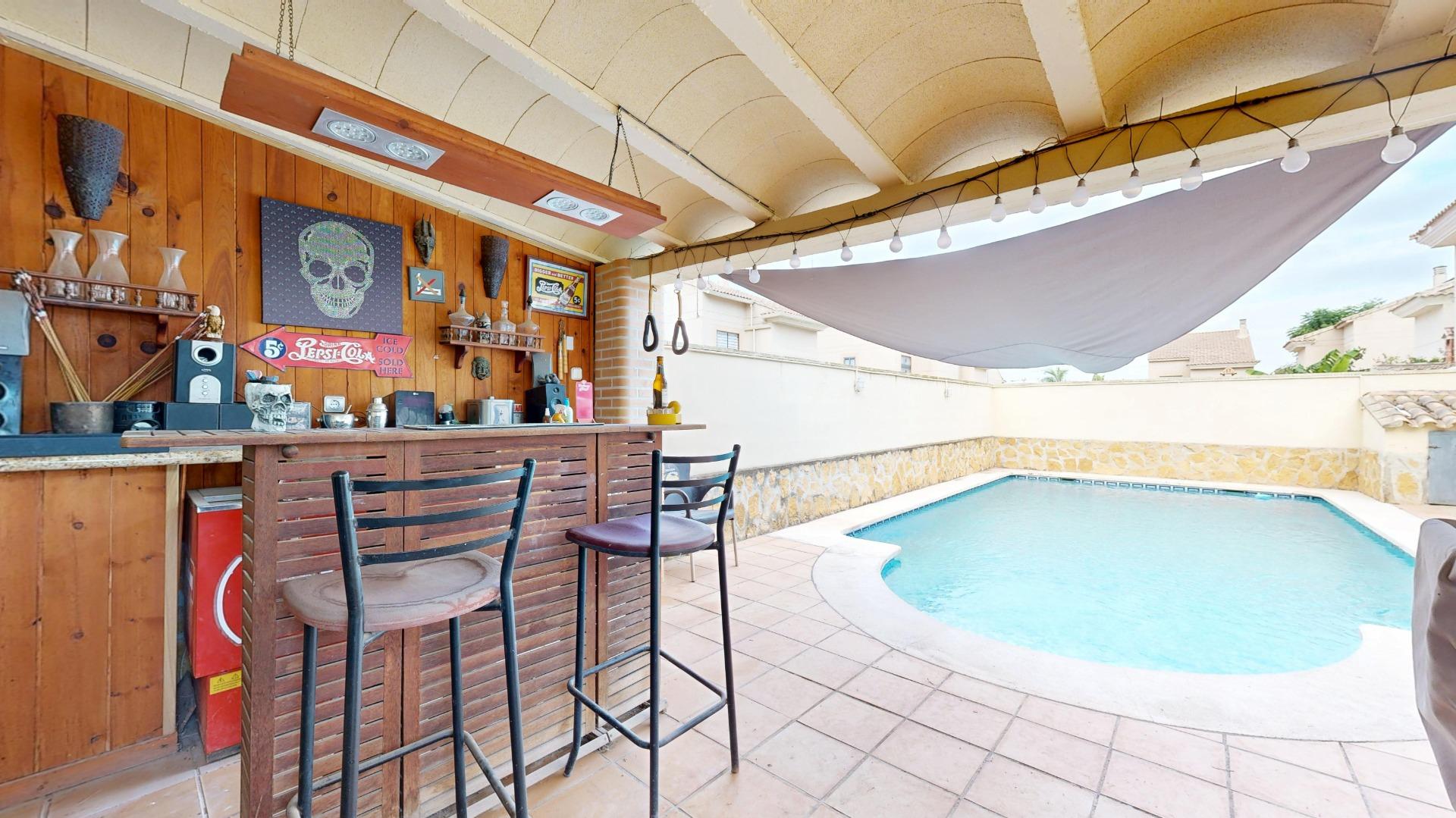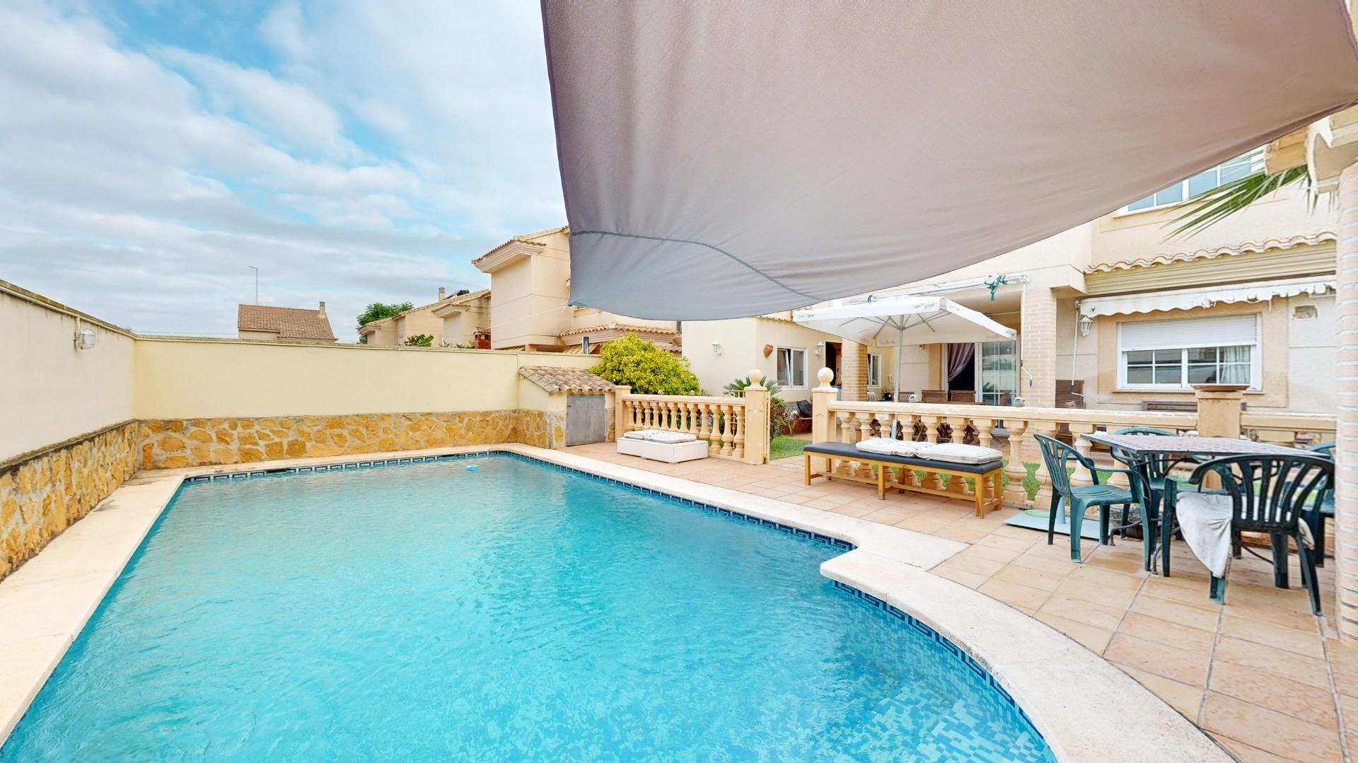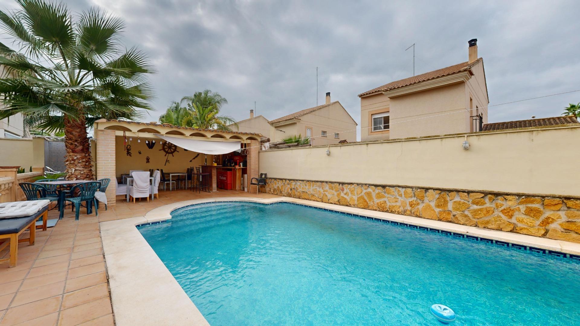 Piscina privada con ducha exterior, cenador y solarium, ideal para reuniones familiares.