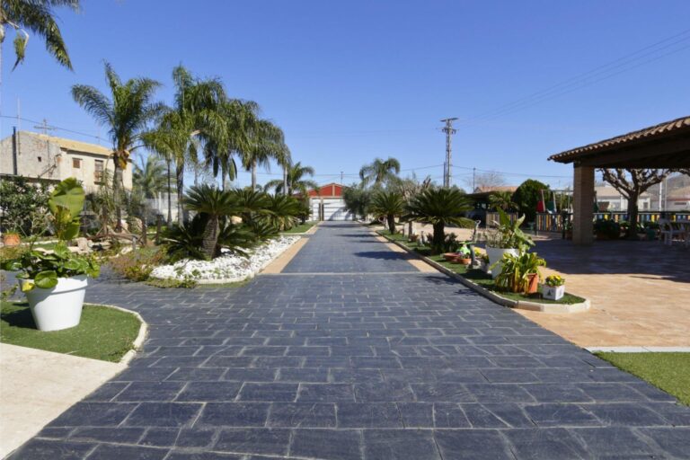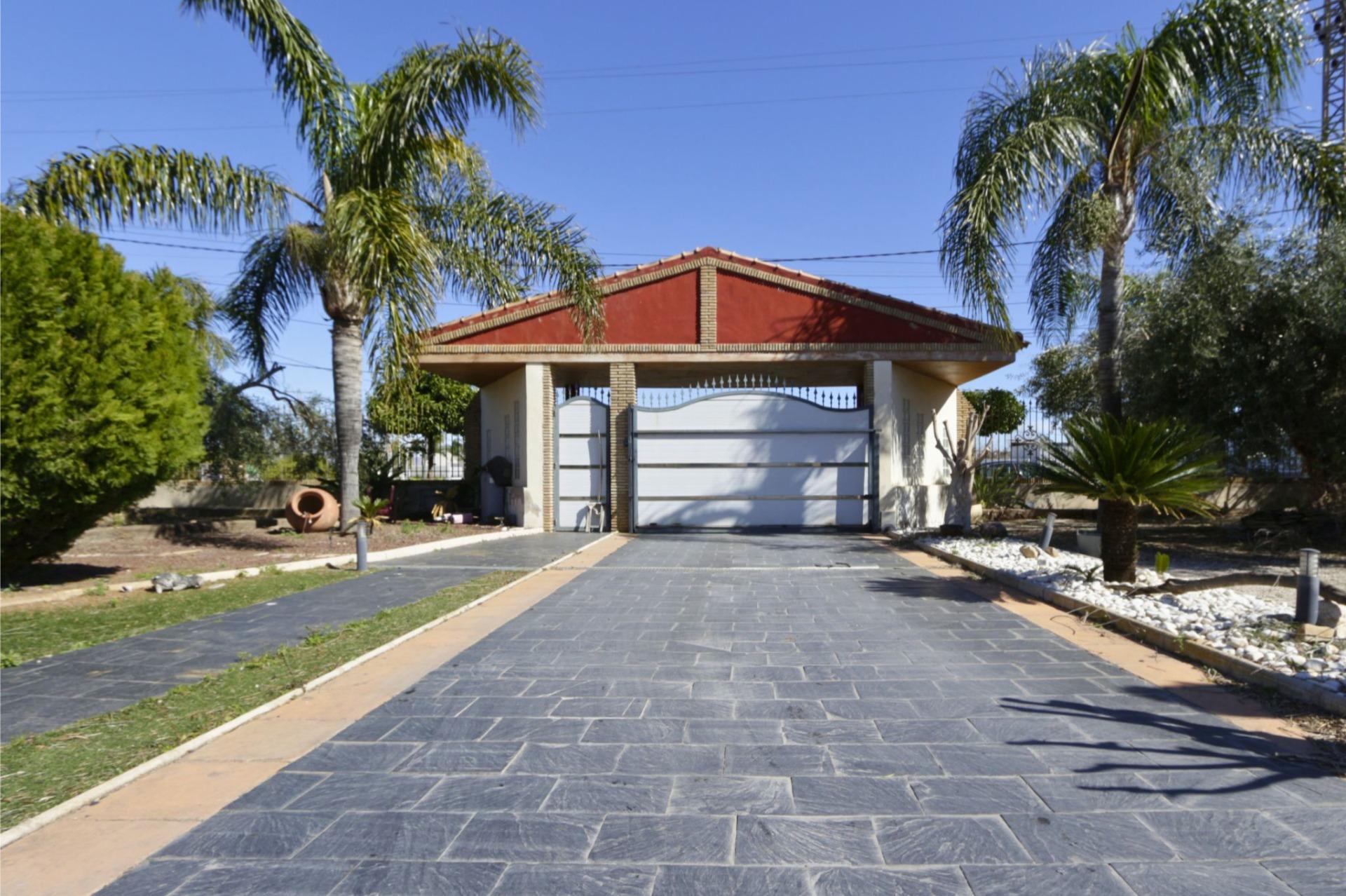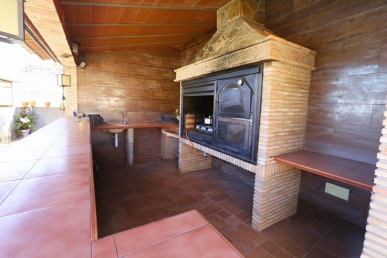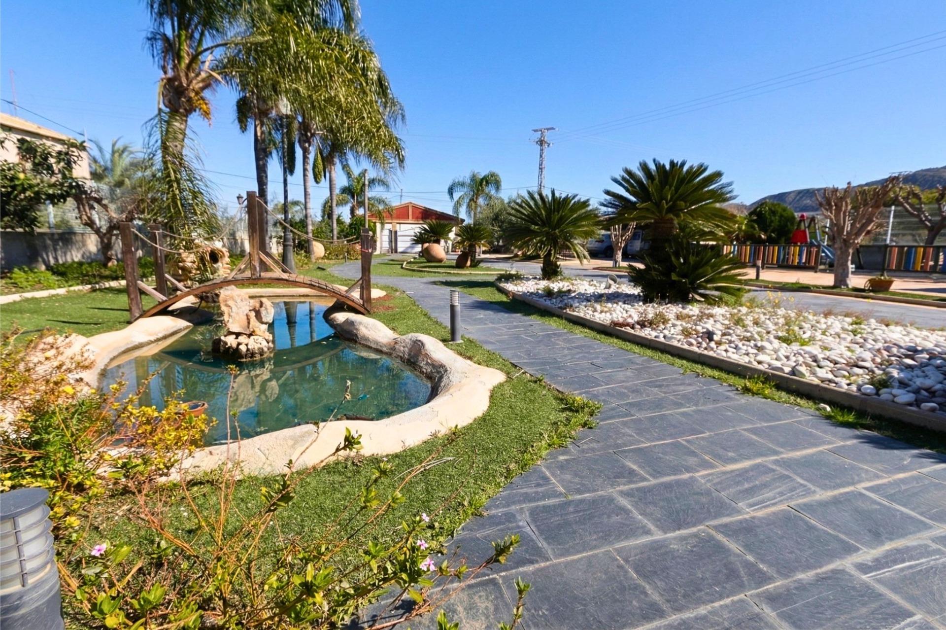 El exterior de la propiedad está pensado para disfrutar al máximo del tiempo en familia. La parcela cuenta con zonas ajardinadas con diferentes especies arbóreas, principalmente palmeras y olivos, que aportan carácter y privacidad al conjunto. Dispone además de zona de aparcamiento cubierta, área de juegos infantiles, pequeño estanque ornamental y una amplia pérgola de aproximadamente 55 m², ideal para comidas familiares o celebraciones al aire libre.