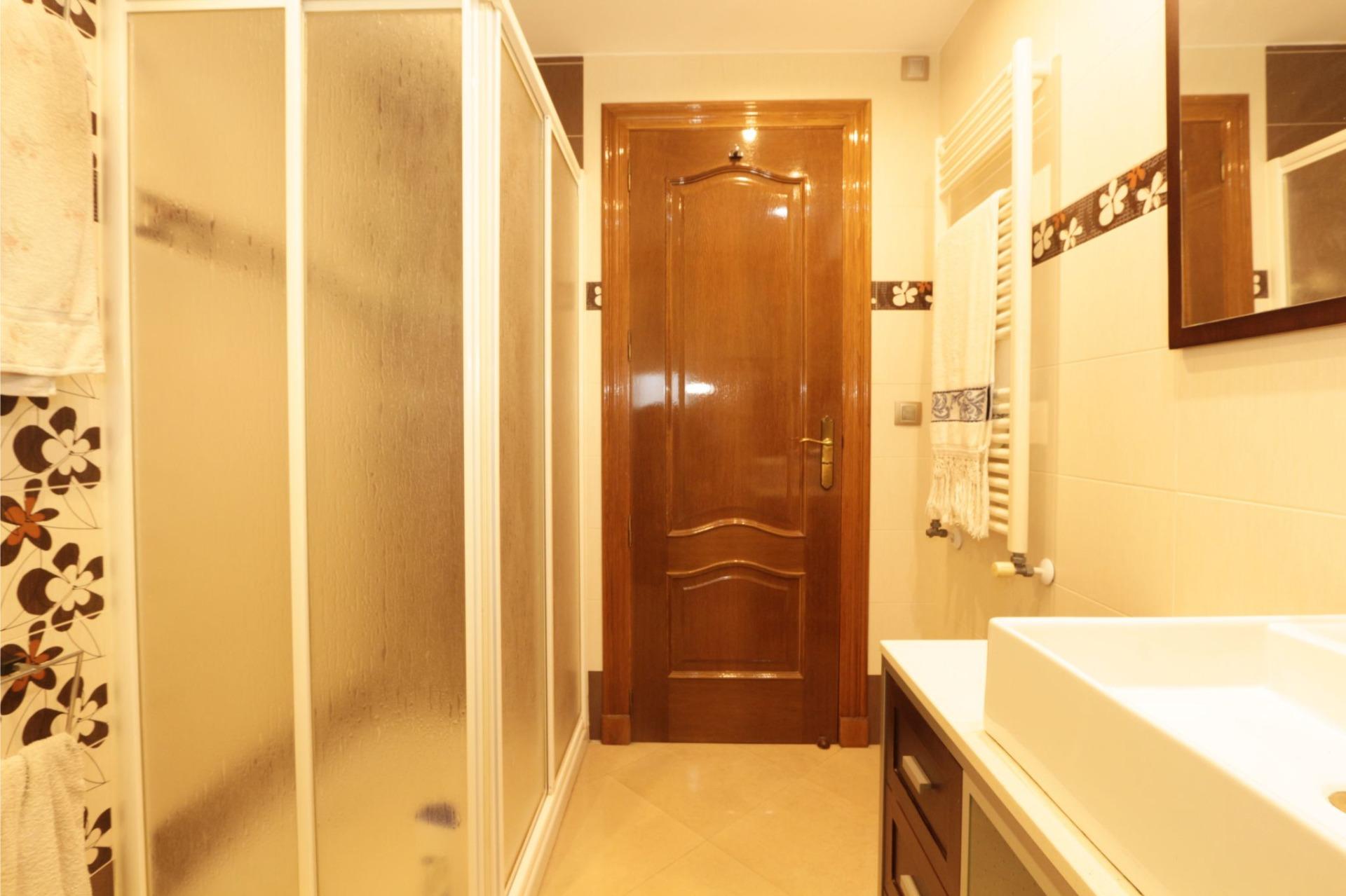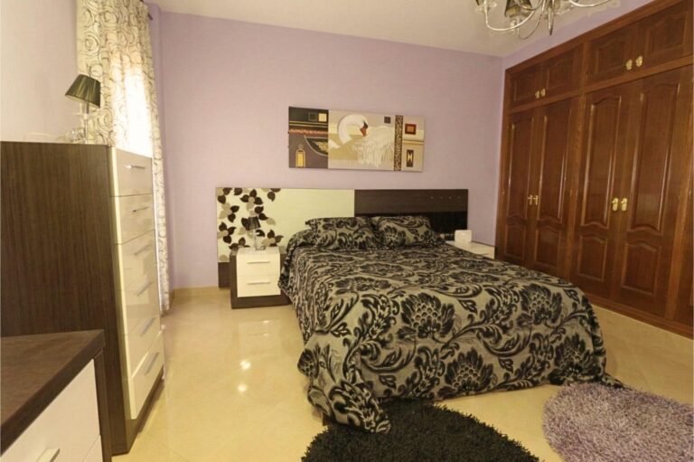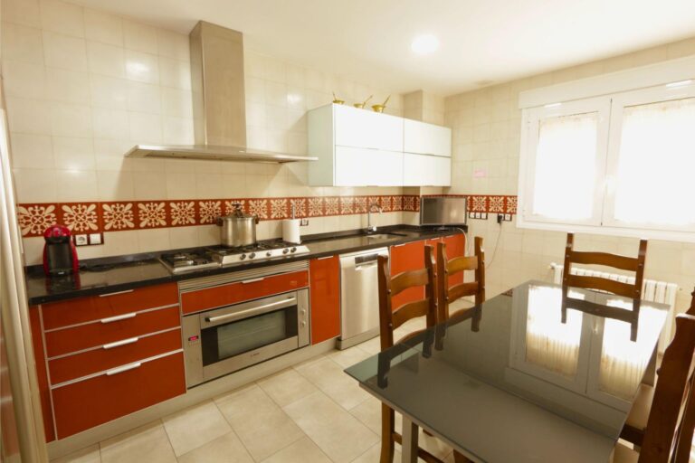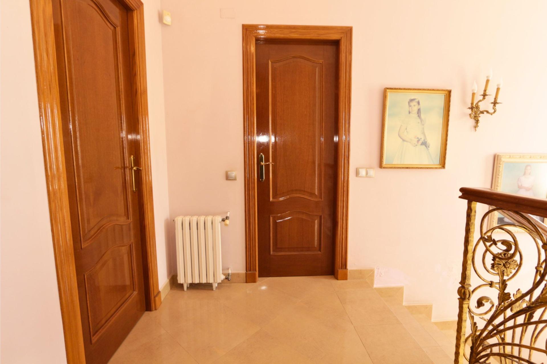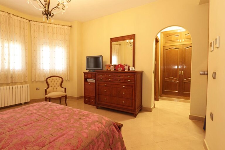 En cuanto a equipamiento, la vivienda dispone de calefacción mediante radiadores de gasoil en todas las estancias y aire acondicionado centralizado frío-calor por conductos, garantizando confort durante todo el año. Cuenta también con puertas interiores de roble, armarios empotrados, sistema de alarma antirrobo, videoportero y ventanas de aluminio blanco con doble acristalamiento tipo Climalit.