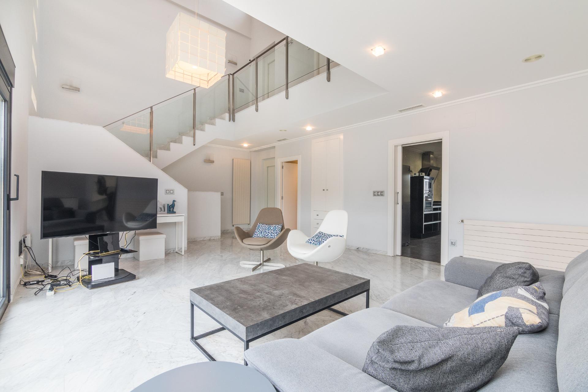 Consta de UNA VIVIENDA DE 350M2 APROX. DE ARQUITECTURA ELEGANTE Y DISTINGUIDA CON TECHOS ALTOS Y ABIERTOS A LA PLANTA MAS ALTA . Su planta baja distribuye el salón con grandes ventanales que filtran luz natural y nos dejan contemplar desde el interior un EXTERIOR LLAMATIVO CON PISCINA , cocina con diseño muy amplia e independiente, y un baño. En la planta mas altas encontramos 3 dormitorios, uno de ellos con vestidor y baño en suite.