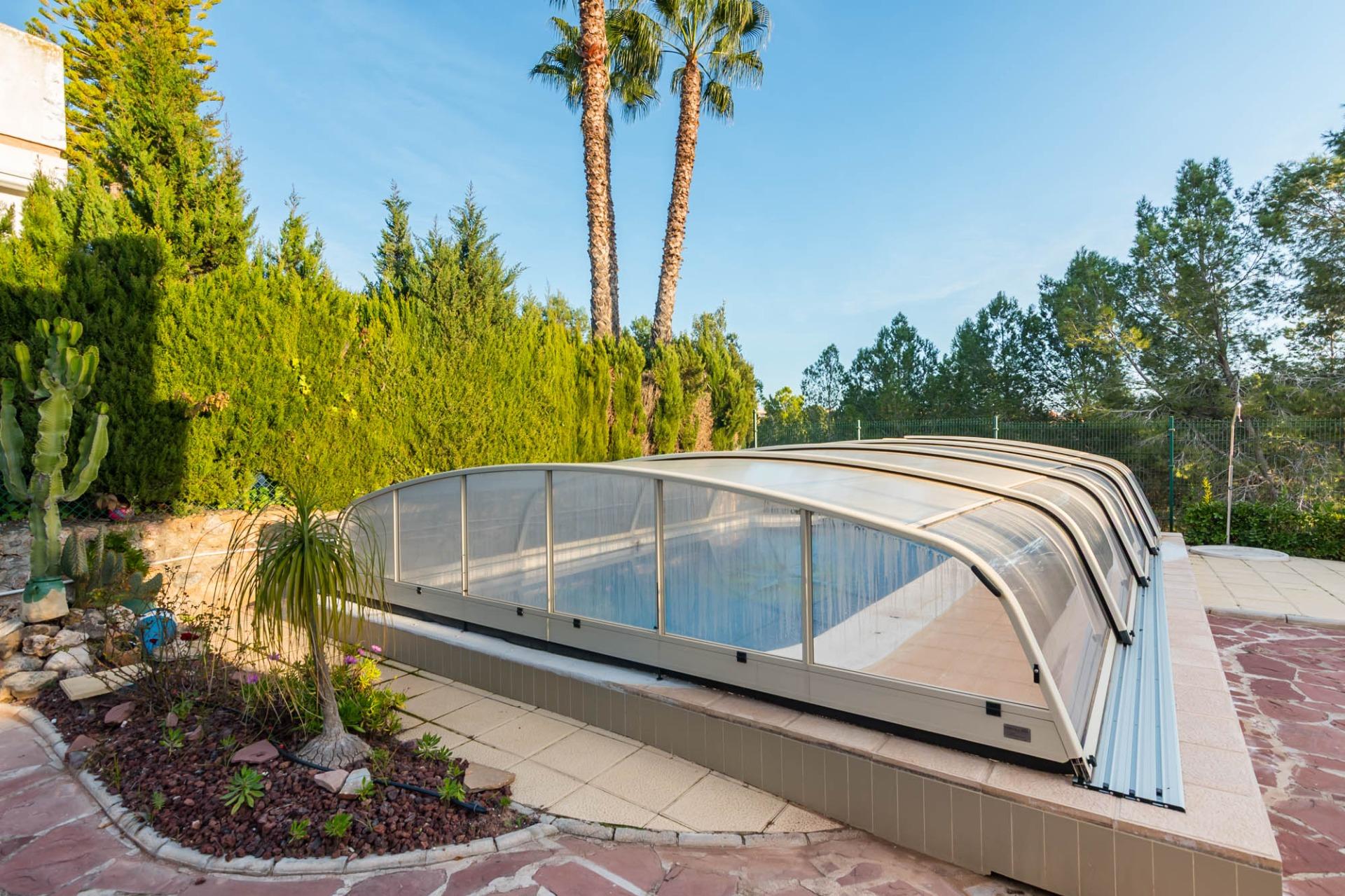 Piscina con cubierta retráctil, ideal para disfrutar de un baño en cualquier época del año.