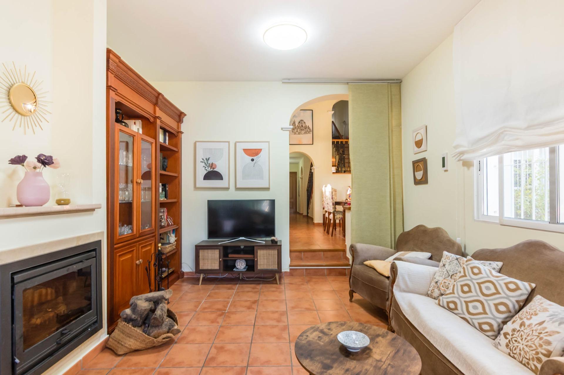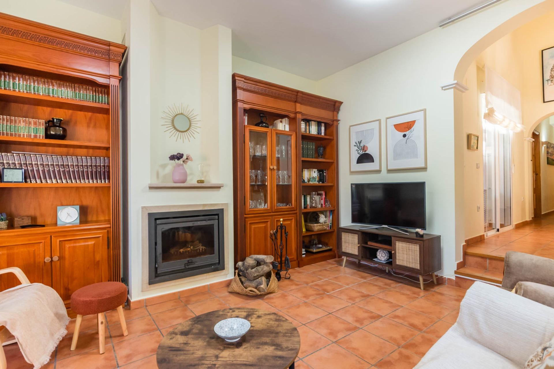 Un salón con chimenea, un lugar cálido y acogedor donde podrás disfrutar de momentos de relax en familia o con amigos. Desde el salón, tienes salida directa a las zonas comunes, donde se encuentran: