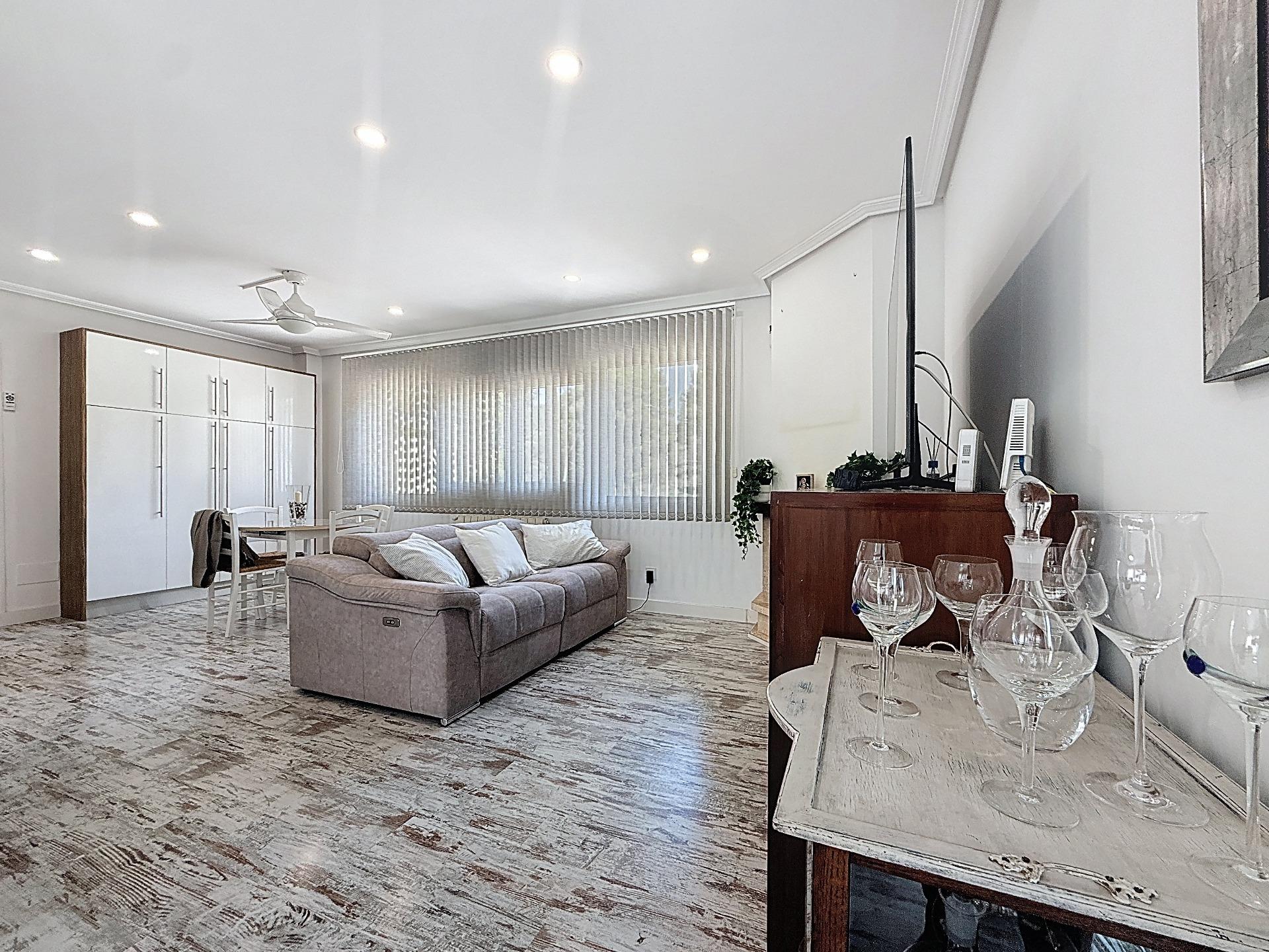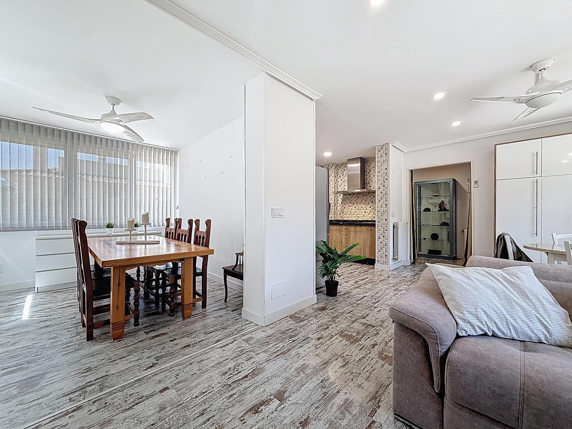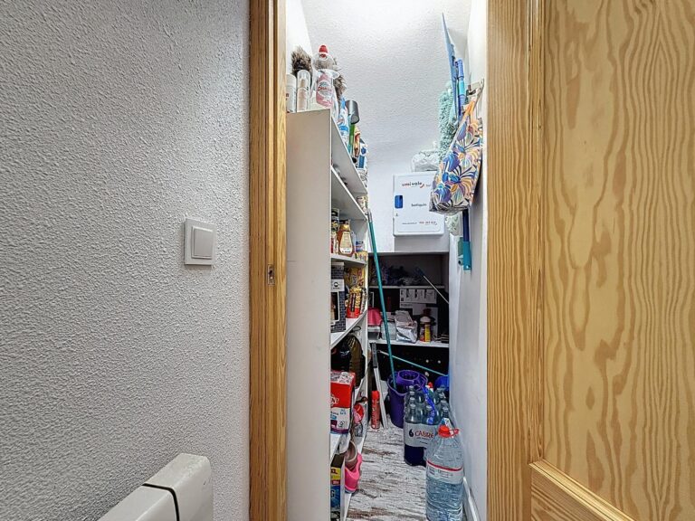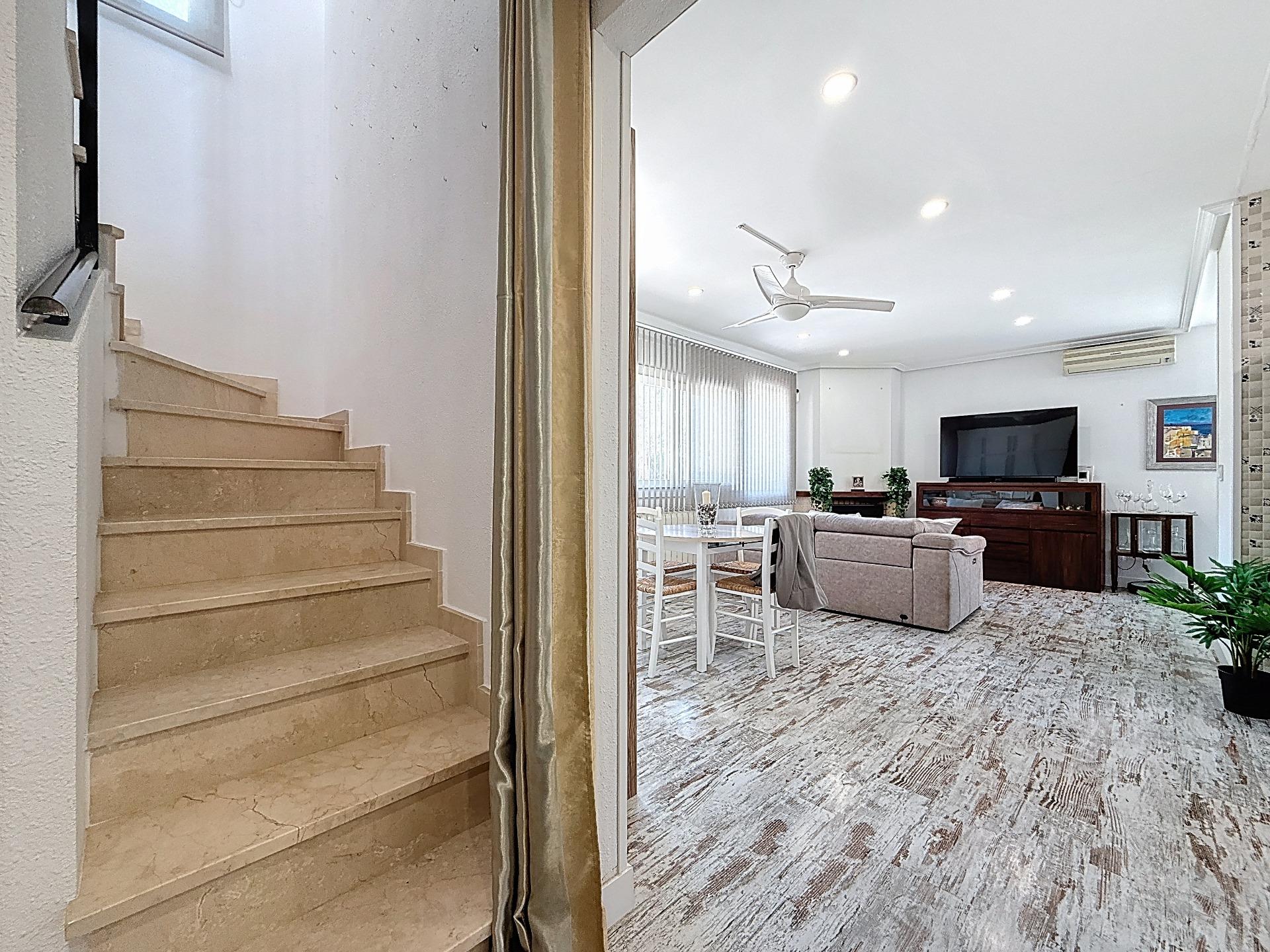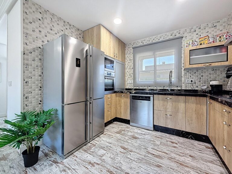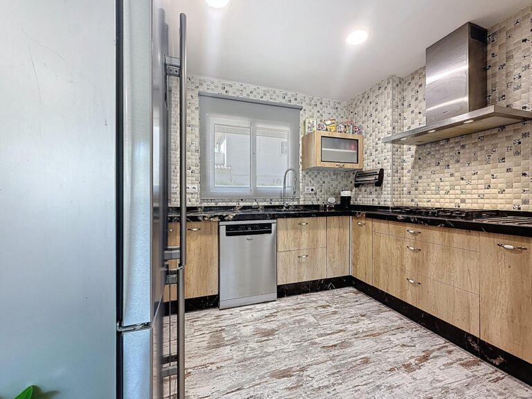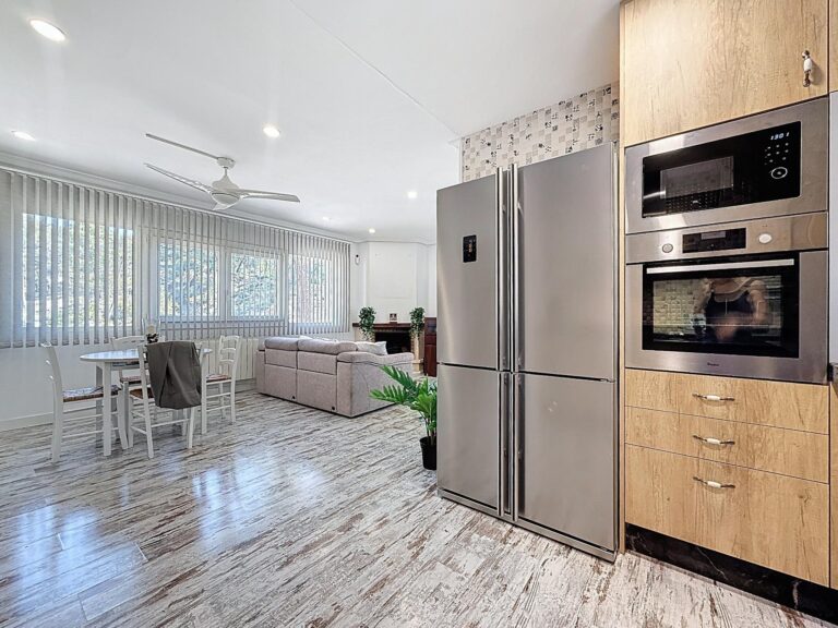 La cocina americana, completamente amueblada y equipada con electrodomésticos, se integra perfectamente en la vivienda, aportando funcionalidad y un ambiente actual. Bajo la escalera, una práctica despensa optimiza el espacio de almacenaje.