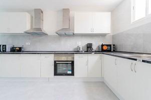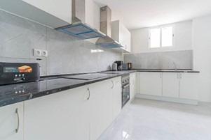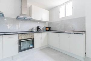 Amplia cocina abierta con electrodomésticos y menaje completo.