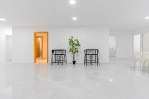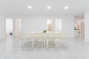 Luminoso salón de grandes dimensiones con mesa, sillas y área de descanso.