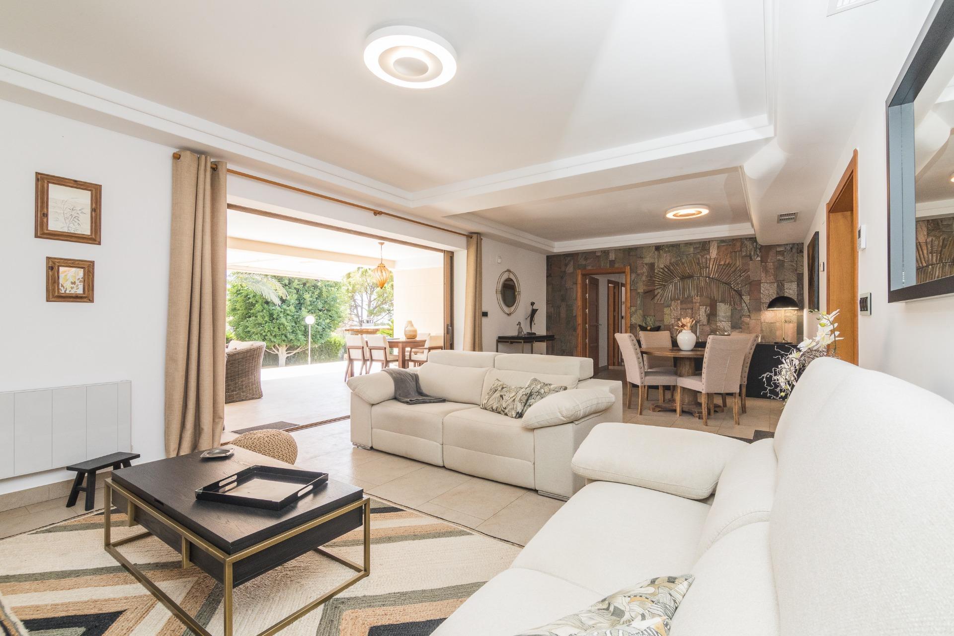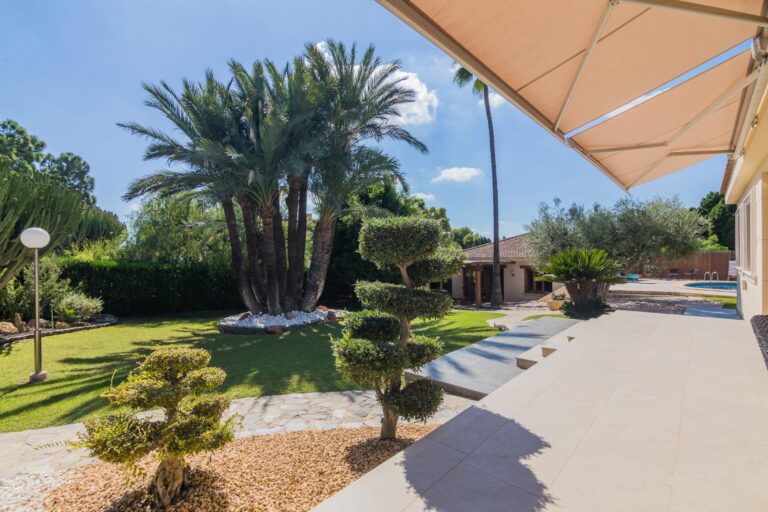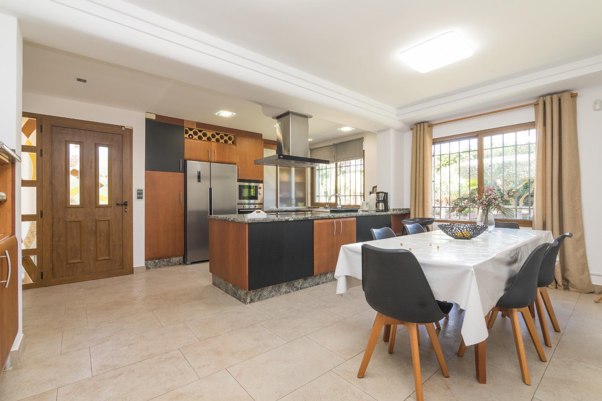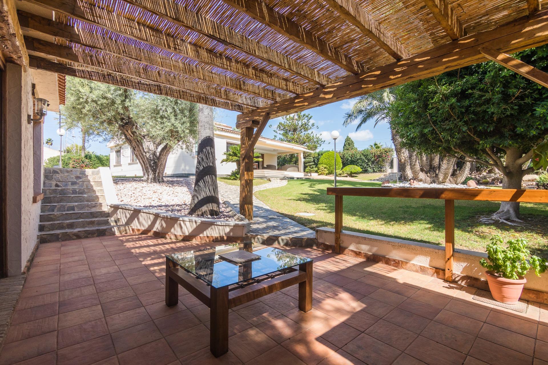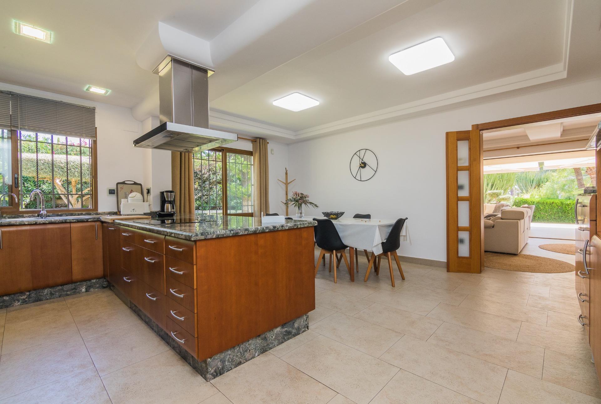 Disfruta de las vistas desde la terraza al exuberante jardín con árboles, y una impresionante palmera de diez brazos. Además, una barbacoa independiente cerrada, con un gran ventanal, te brinda un espacio perfecto para reuniones al aire libre, tanto en verano como en invierno.