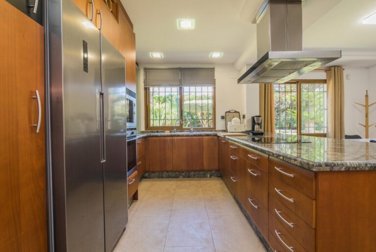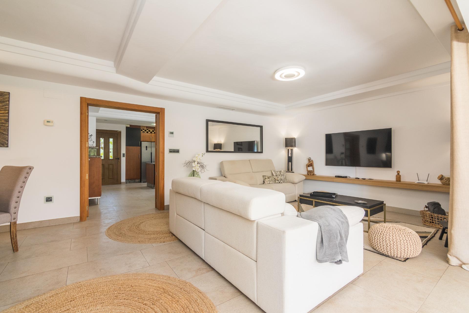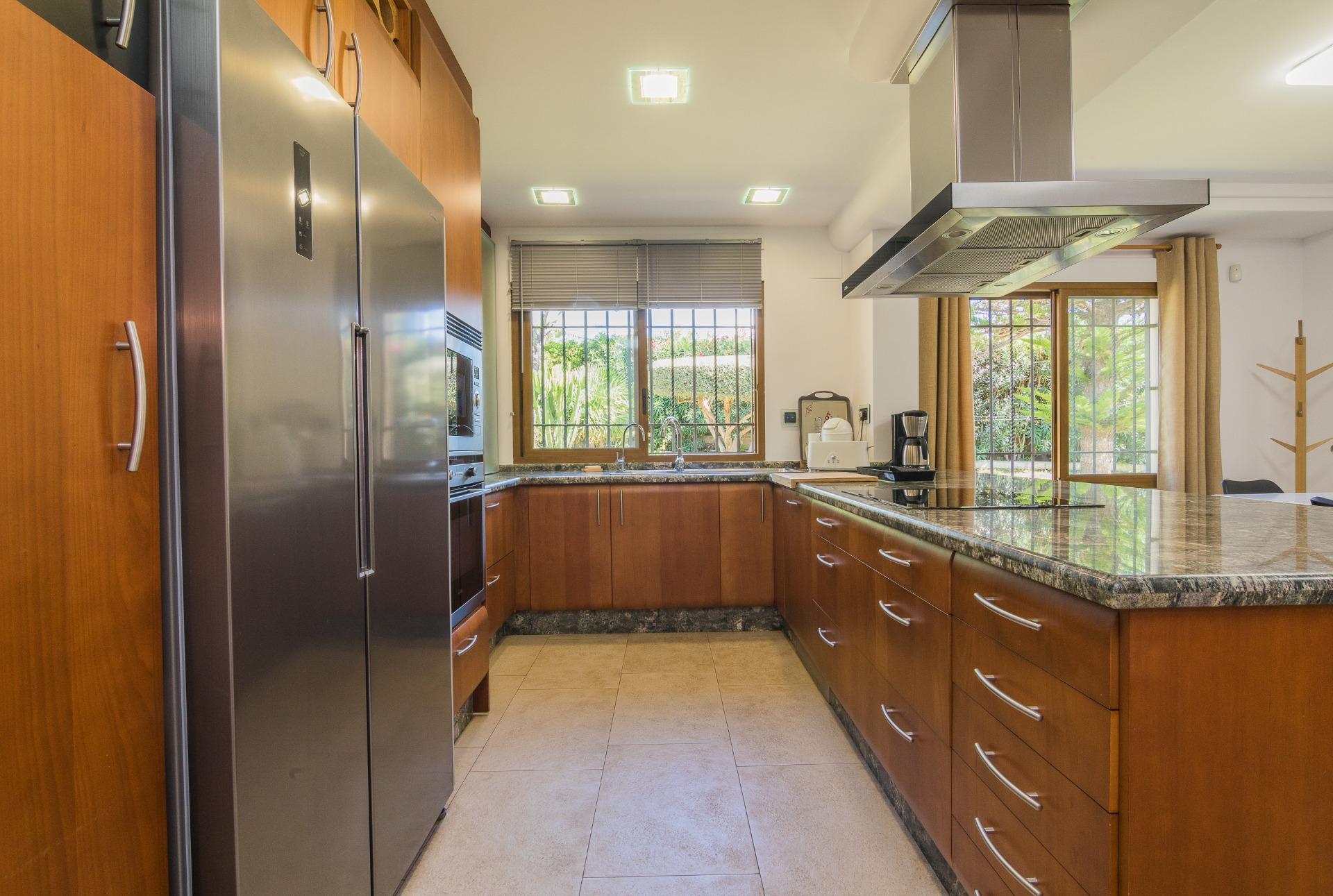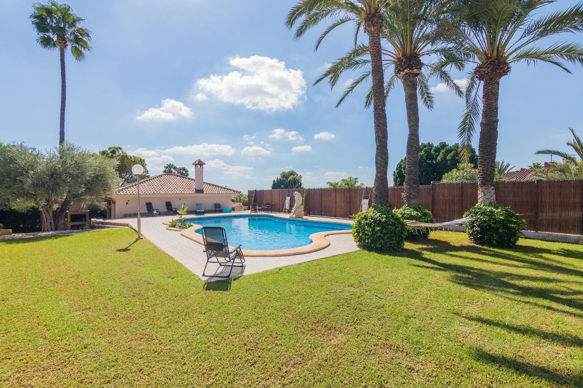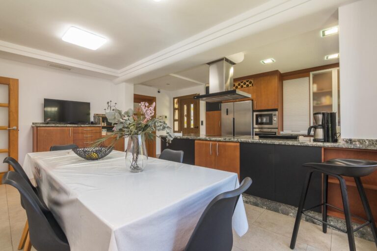 Disfruta de las vistas desde la terraza al exuberante jardín con árboles, y una impresionante palmera de diez brazos. Además, una barbacoa independiente cerrada, con un gran ventanal, te brinda un espacio perfecto para reuniones al aire libre, tanto en verano como en invierno.