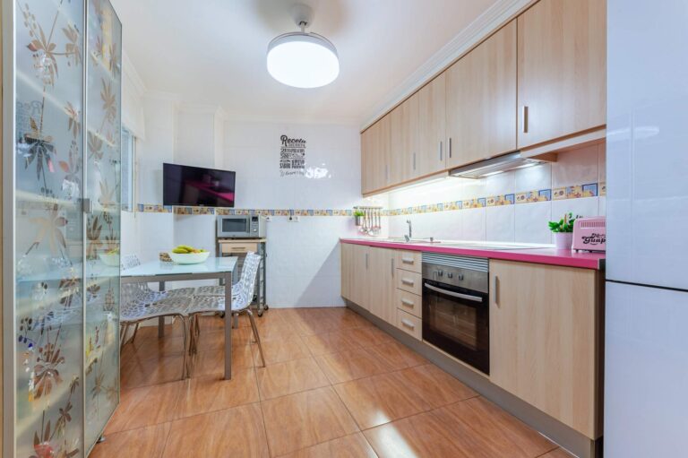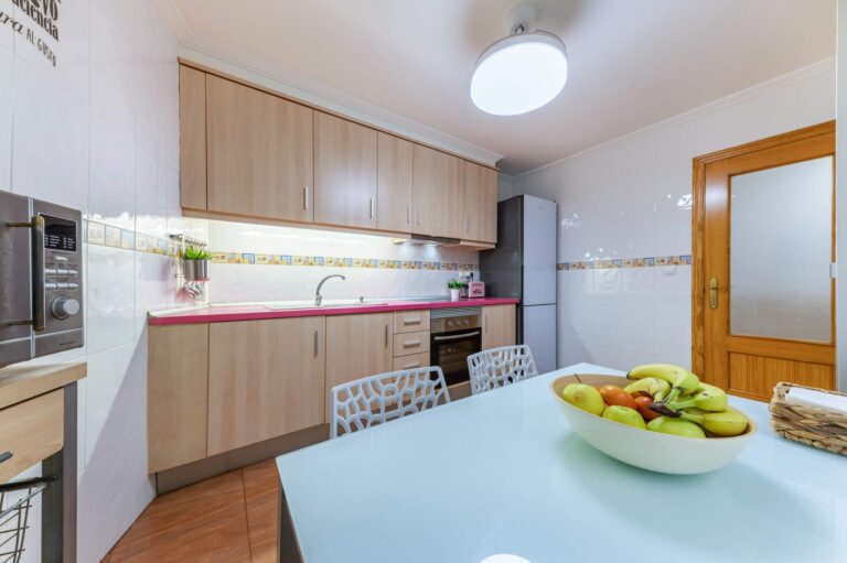 El salón, amplio y luminoso, invita a tardes largas de sofá, charlas sin reloj y domingos en casa. La cocina independiente ofrece espacio real para cocinar juntos, desayunar con calma o ayudar con los deberes mientras se prepara la cena.
