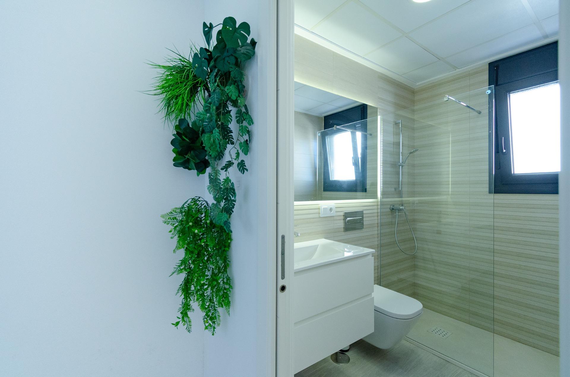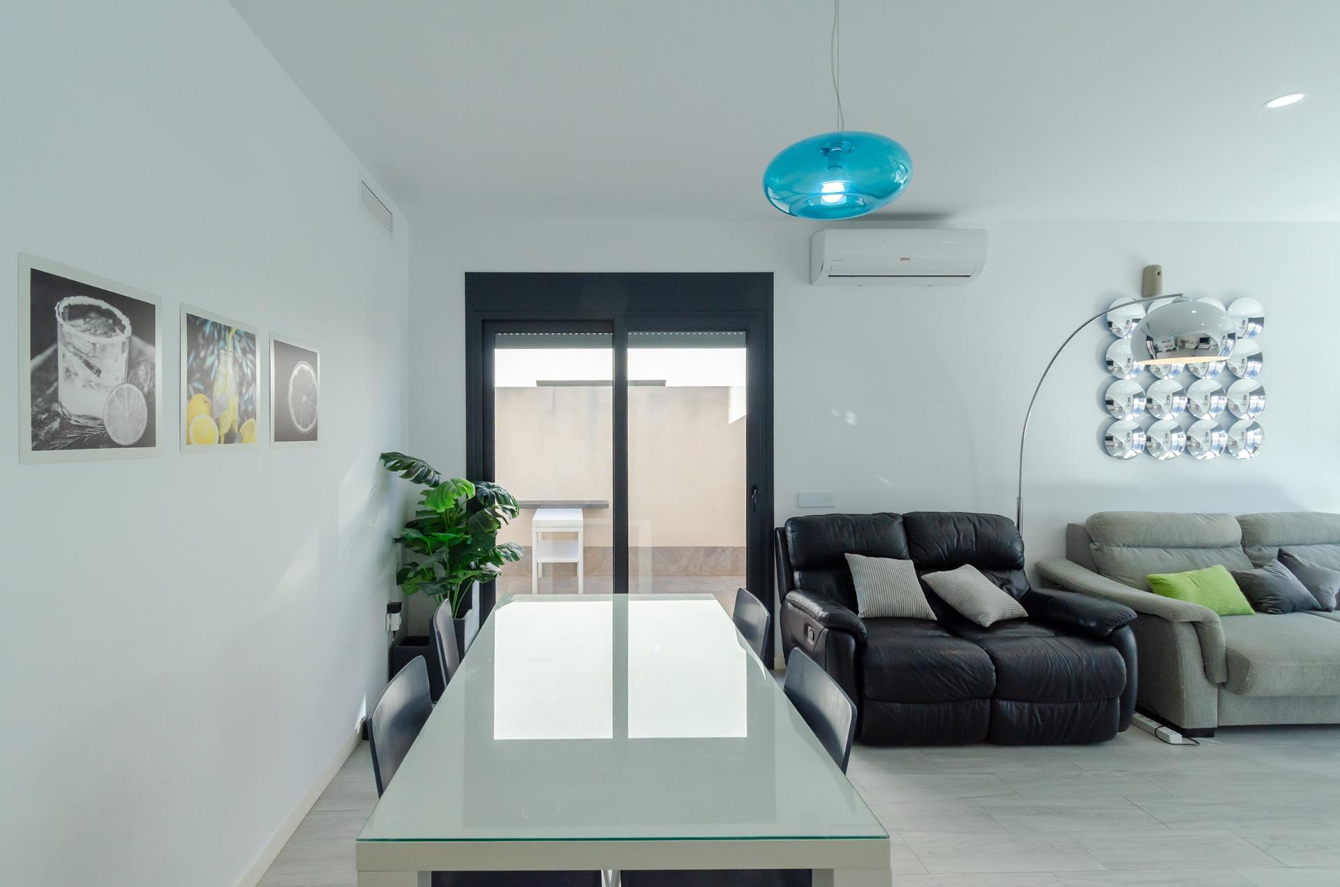 Tu hogar interior: un salón amplio y luminoso abierto a una cocina moderna, tres dormitorios con armarios empotrados, dos baños de diseño y una terraza superior que invita al relax.