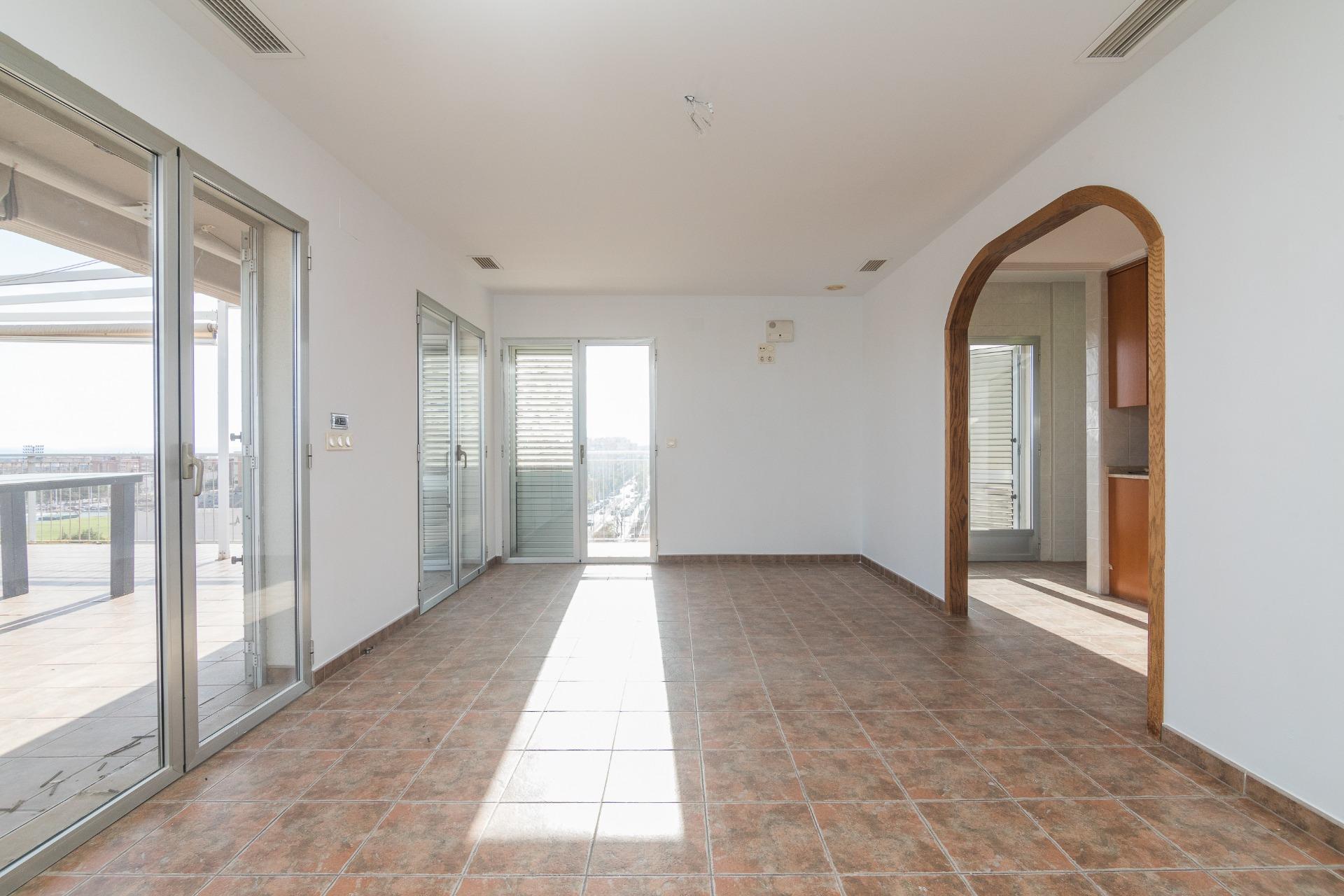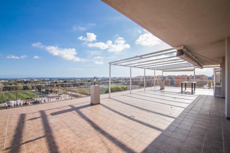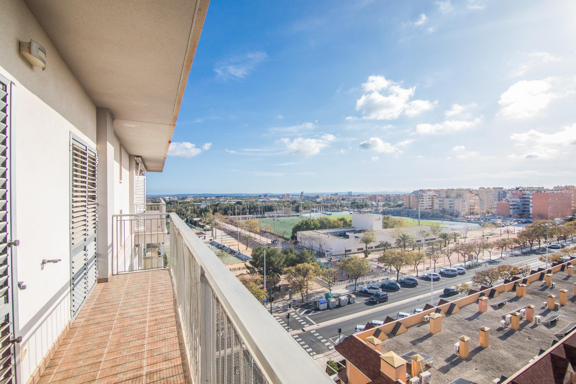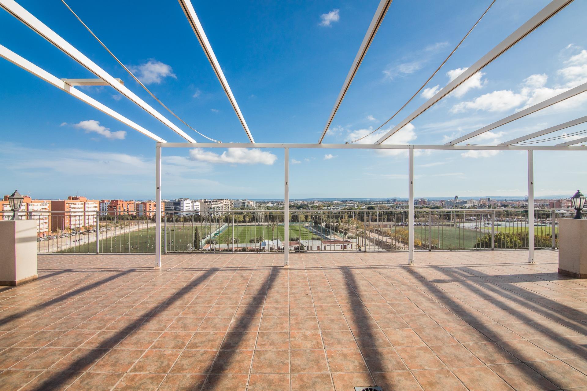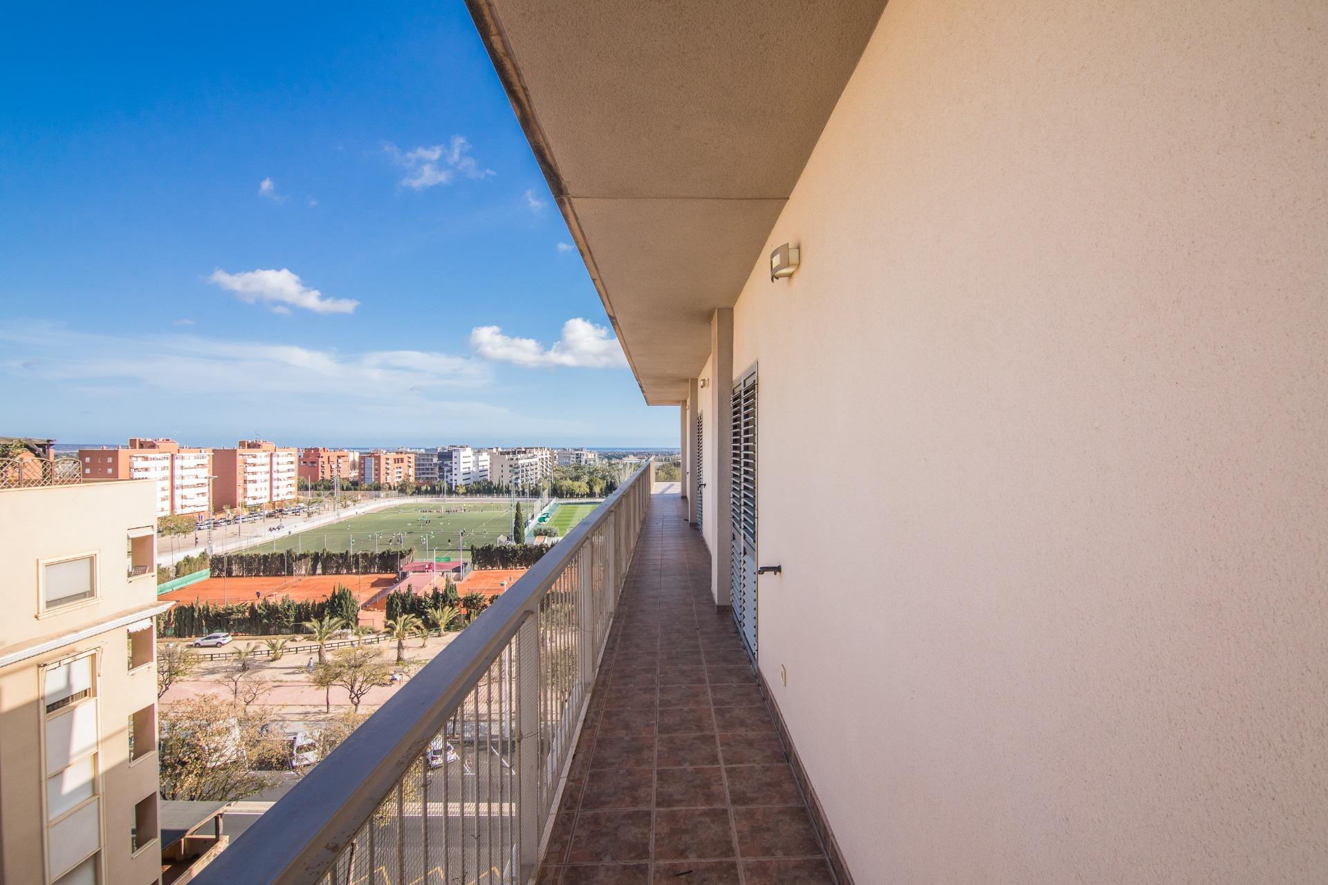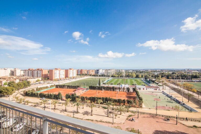 La vivienda cuenta con amplios espacios con 4 dormitorios, el de matrimonio cuenta con VESTIDOR Y BAÑO , un baño que da servicio al resto de la vivienda prestando comodidad y funcionalidad por su gran tamaño , con una eficiente distribucion tenemos una ESPECTACULAR COCINA COMEDOR y galería, IMPONENTE SALÓN muy luminoso y ventilado además de gozar de la virtud de estar comunicado con SU EXCLUSIVA TERRAZA QUE SE FUNDE CON EL PAISAJE HACIA LA CIUDAD DEPORTIVA SIENDO LO MAS IMPRESIONANTE DE ESTA VIVIENDA PORQUE ES VERDADERAMENTE ENORME. Desde allí podrás disfrutar de vistas panorámicas incluso el Mar Mediterráneo . La terraza está diseñada para ser un espacio ideal para relajarse o disfrutar con la familia, con diferentes orientaciones para percibir el sol a cualquier hora del dia. Cuenta con extra de aire acondicionado por conductos y toldo en terraza.