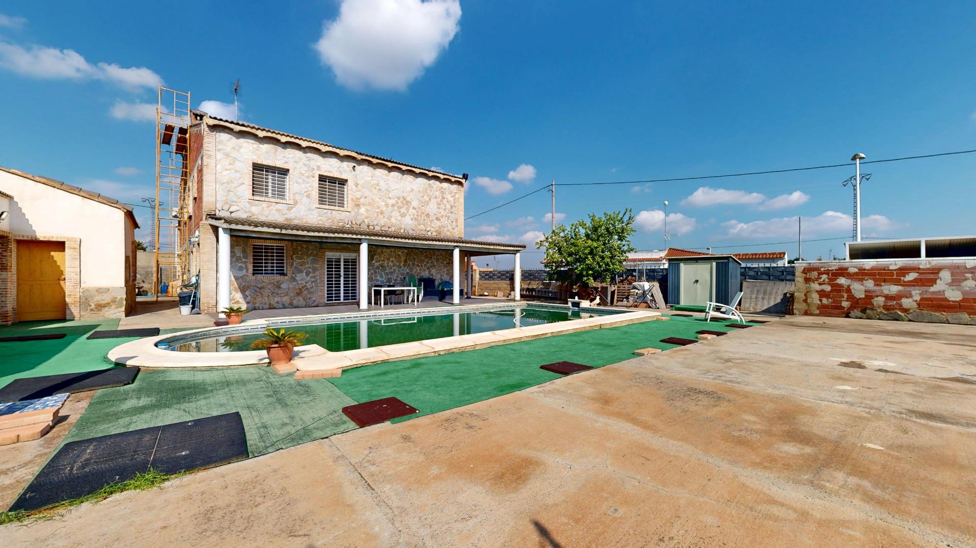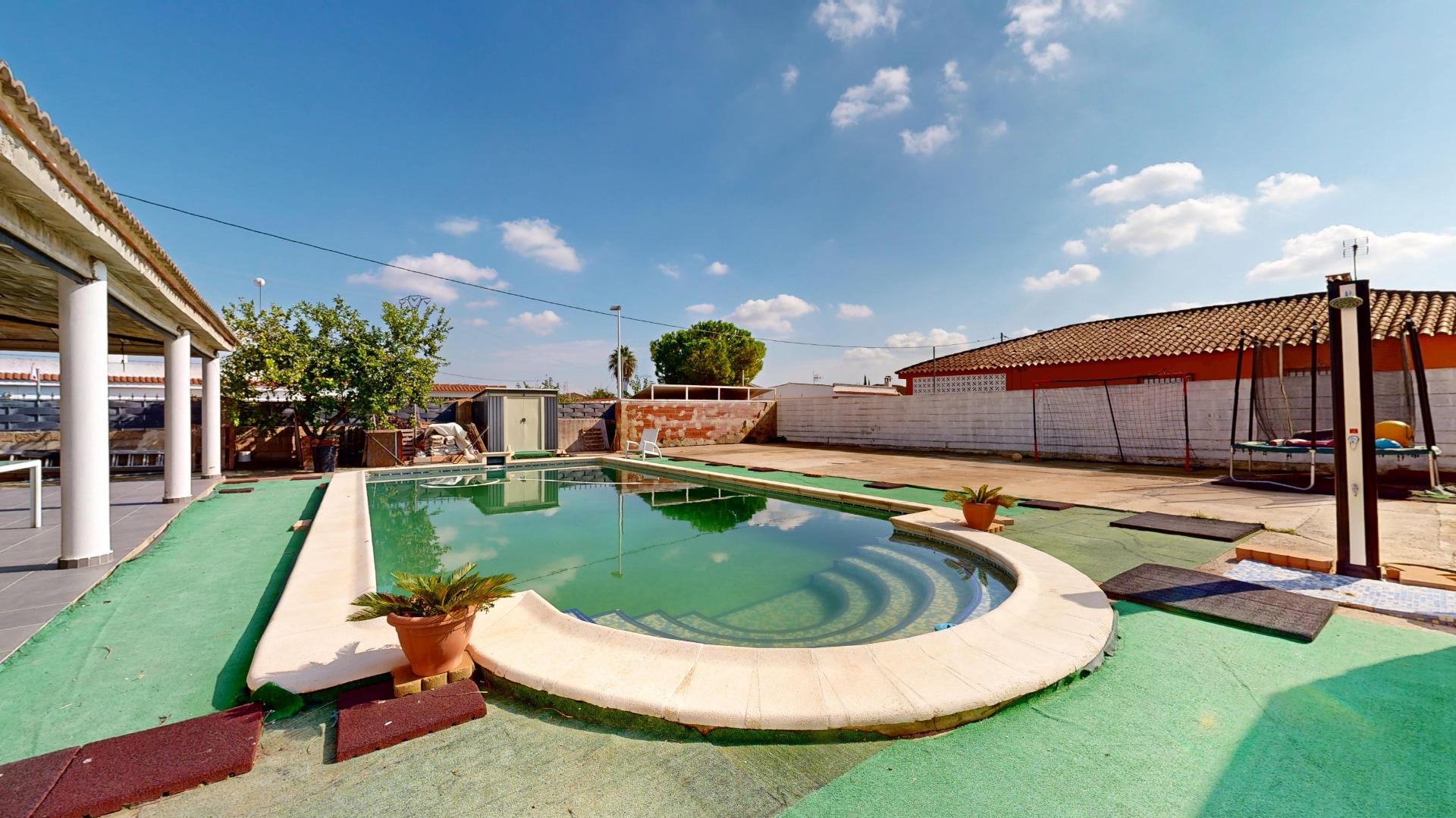 Piscina con depuradora, rodeada de espacio para tomar el sol y disfrutar del aire libre.
