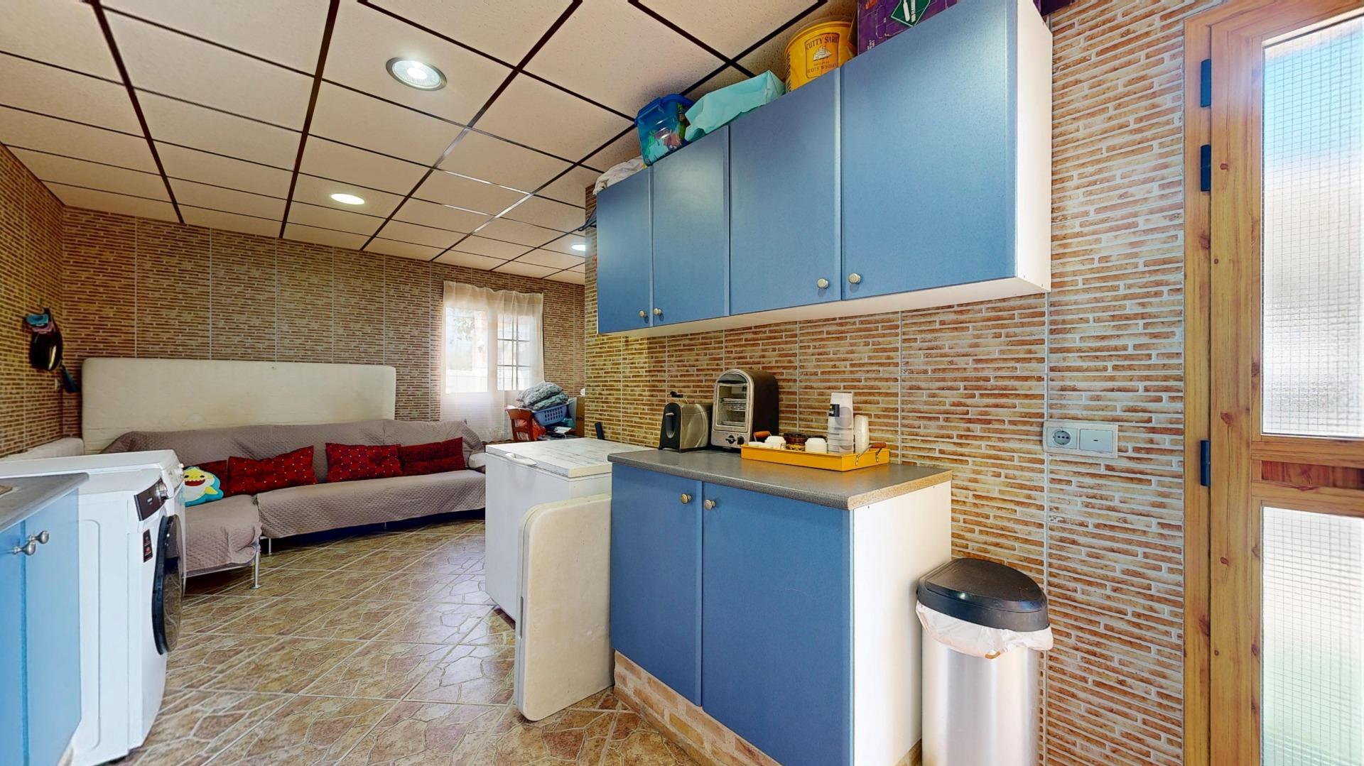 Casita de invitados con salón, cocina y aseo exterior: privacidad total para visitas.