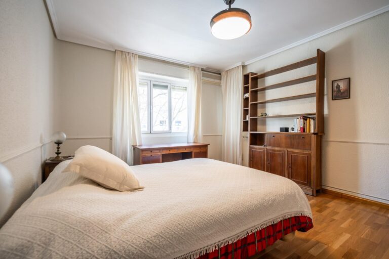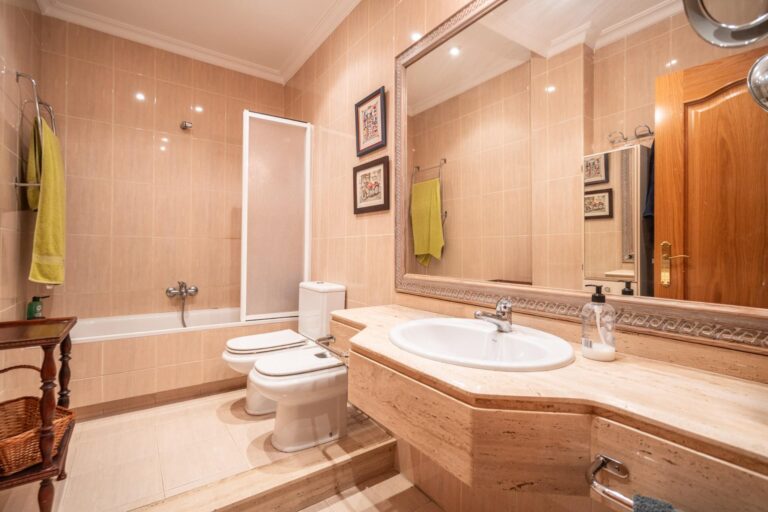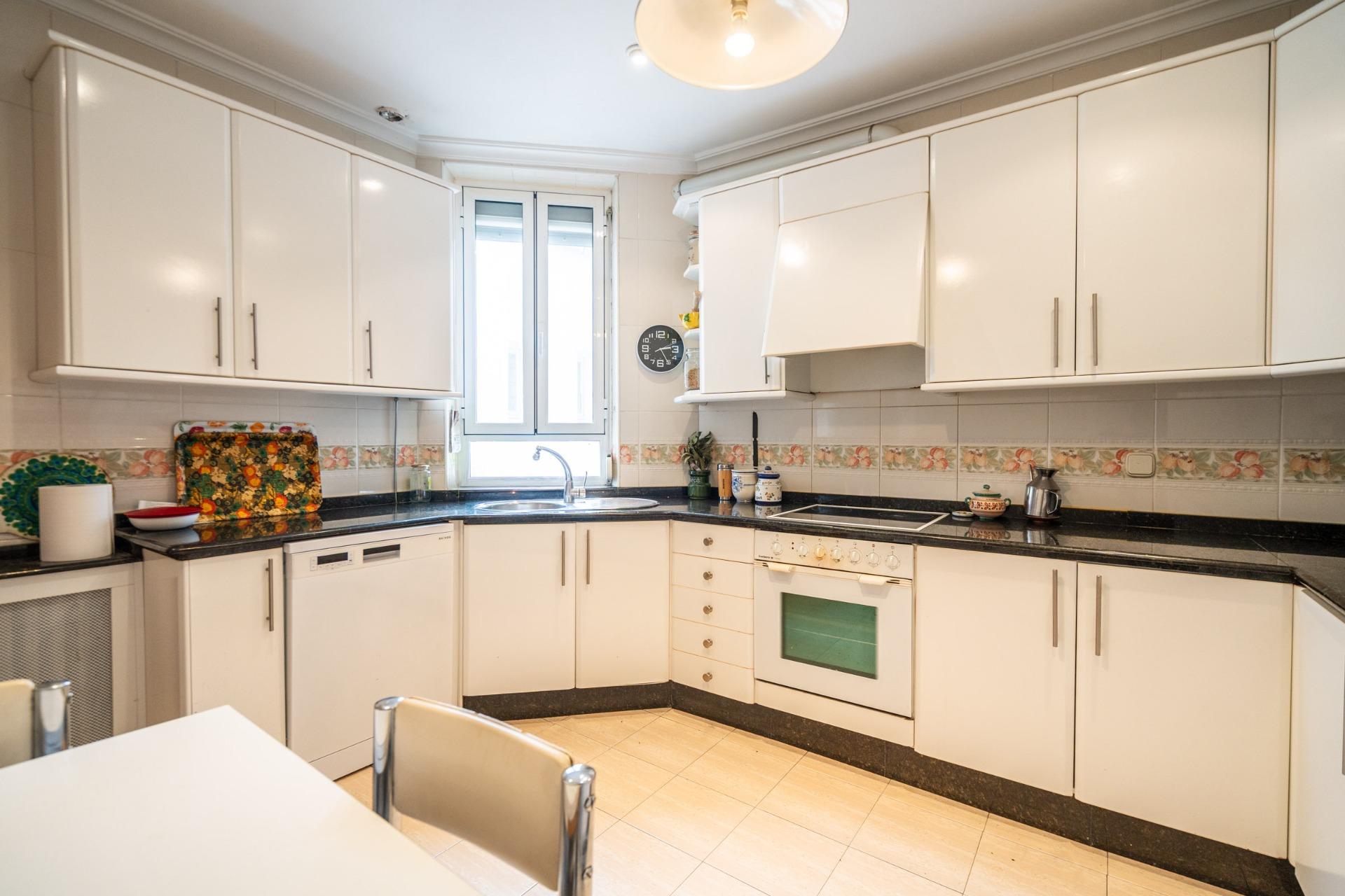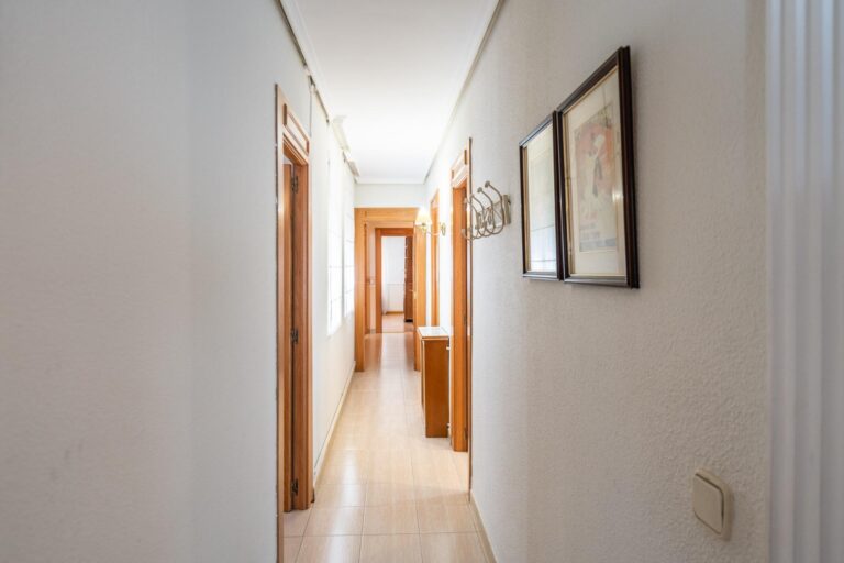 En cuanto a los acabados, la vivienda combina suelos de gres con tarima de madera en los dormitorios, baños y cocina alicatados hasta el techo, destacando el uso de mármol travertino en uno de los baños. Cuenta con puertas interiores de roble, ventanas de aluminio con doble acristalamiento tipo climalit y techos altos con molduras que refuerzan la sensación de amplitud y elegancia. La cocina se entrega amueblada con electrodomésticos, con posibilidad de actualización según necesidades.