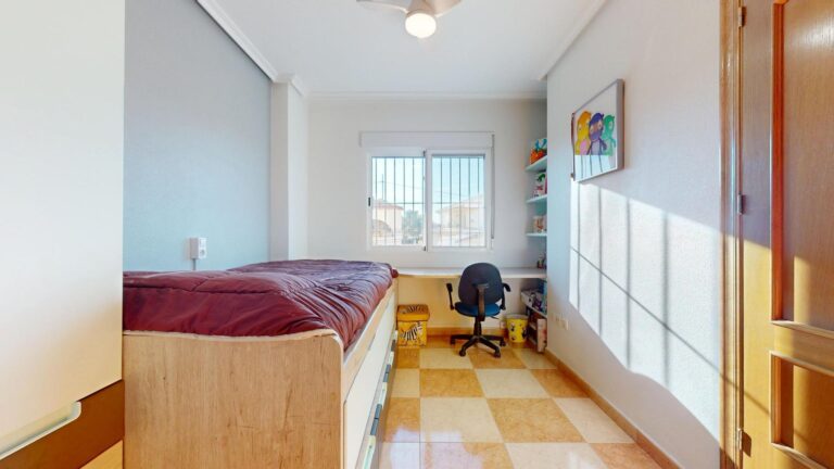 En el ala izquierda del pasillo se distribuye la zona de descanso: **tres dormitorios** acogedores y bien proporcionados. El dormitorio principal dispone de **baño en suite**, aportando privacidad y comodidad. Un **segundo baño completo** da servicio al resto de la vivienda, ideal para familia, invitados o para tener un baño de apoyo sin depender del principal.