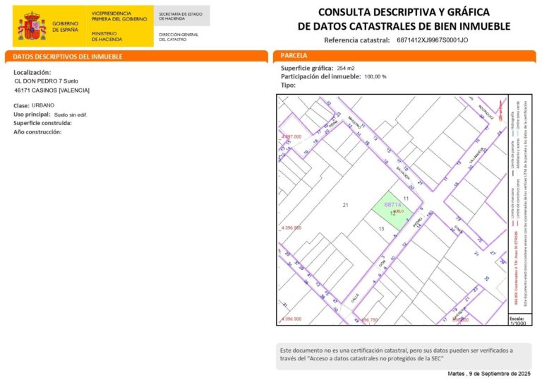 Se vende terreno urbano de 215 m², idealmente ubicado en el encantador pueblo de Casinos, a solo unos pasos de comercios, supermercados y todos los servicios locales.