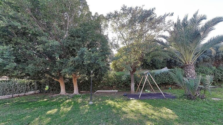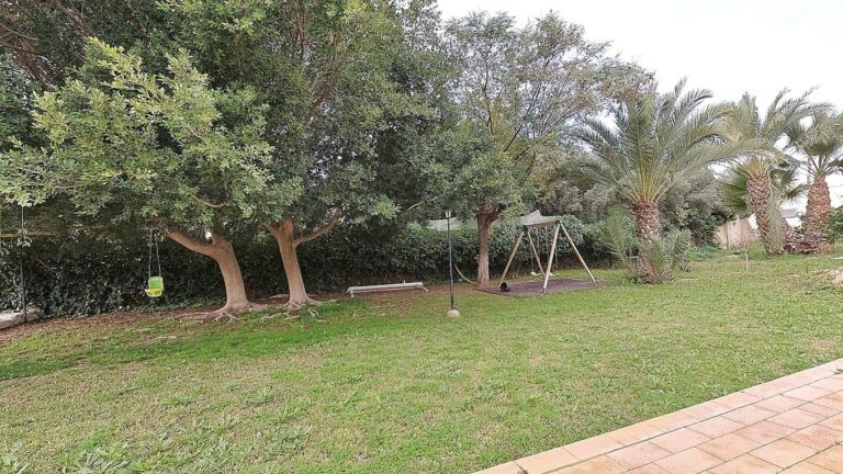 El jardín, con riego automático y árboles grandes que proporcionan sombra, es un espacio ideal para que los niños jueguen en la zona infantil equipada con columpios.