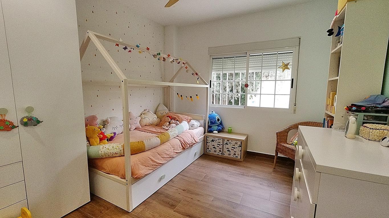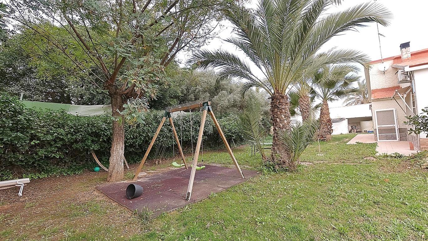 El jardín, con riego automático y árboles grandes que proporcionan sombra, es un espacio ideal para que los niños jueguen en la zona infantil equipada con columpios.