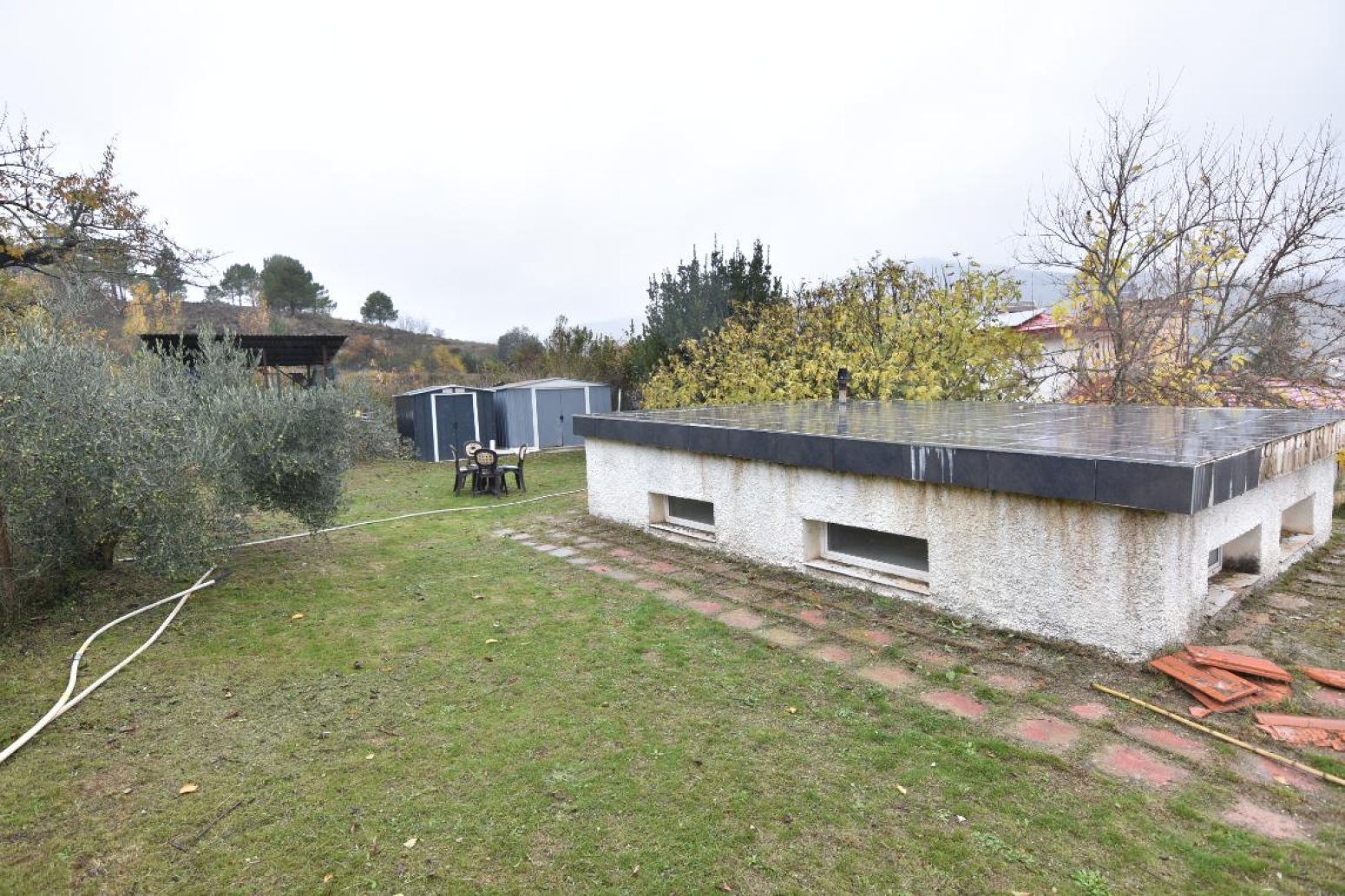 La propiedad tiene varios espacio para apeos y dos almacenes en la zona de la pista de tenis, La luz proviene de placas solares y por lo tanto es autosuficiente y el agua procede del propio manantial que emana de la propia propiedad. Todo un lujo al servicio propio. además hay dos manantiales mas que salen de la propiedad. Zona de cultivo de diferentes frutales además de una zona donde anteriormente había una pista de tenis.