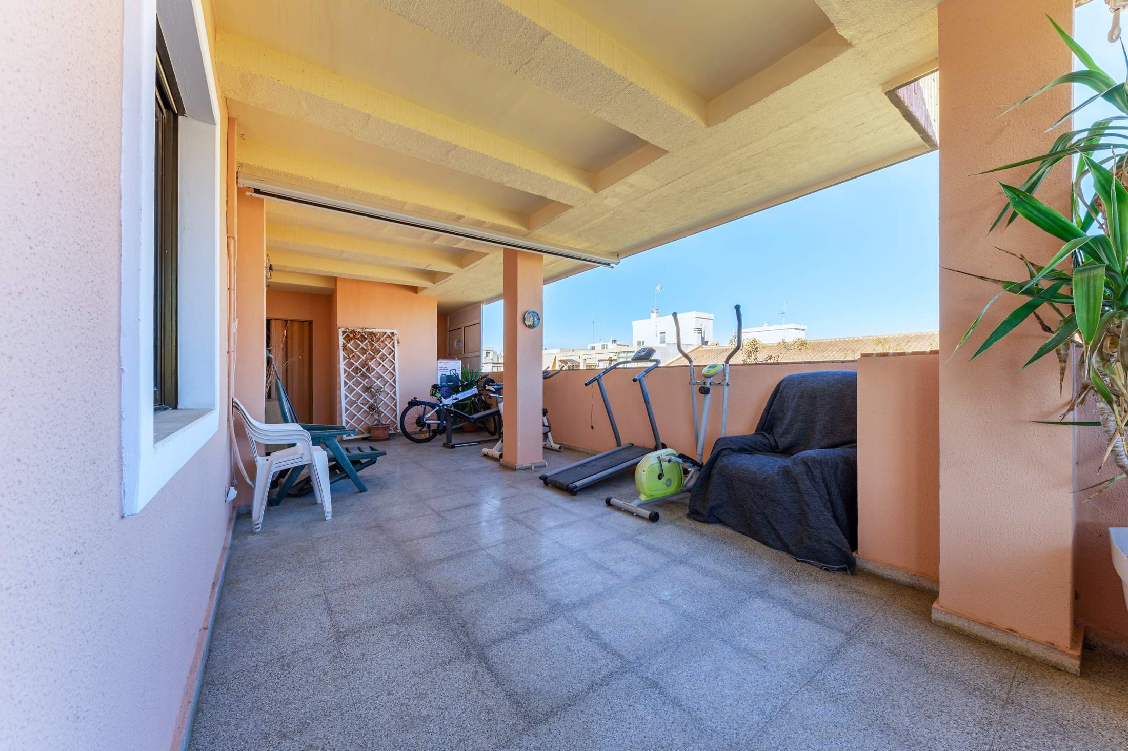 La terraza, casi totalmente cubierta, con toldos y sin cerrar, permite crear distintos ambientes: zona de comedor, espacio de descanso, barbacoa o incluso un rincón para leer o entrenar. Un lugar que se adapta a ti, a tu familia y a cada momento del año.